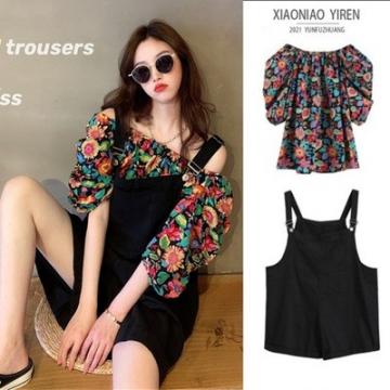 BY16709# 套装夏装新款设计感花色衬衫背带裤短裤两件套