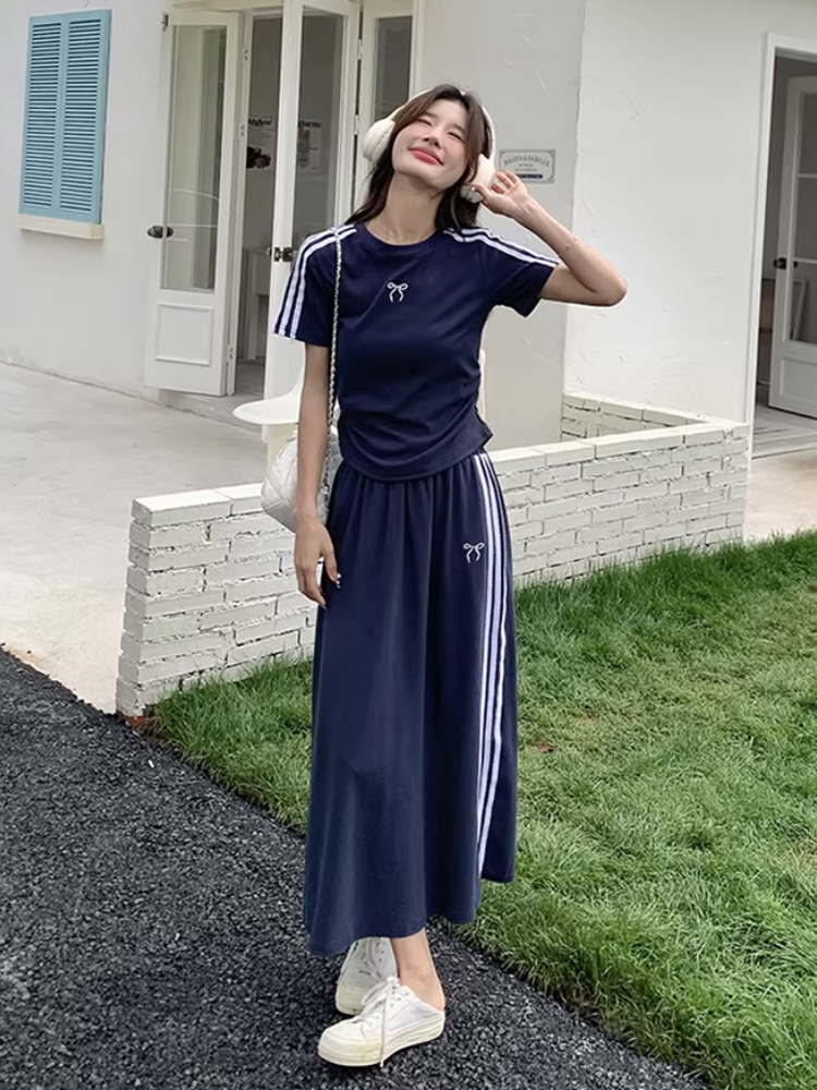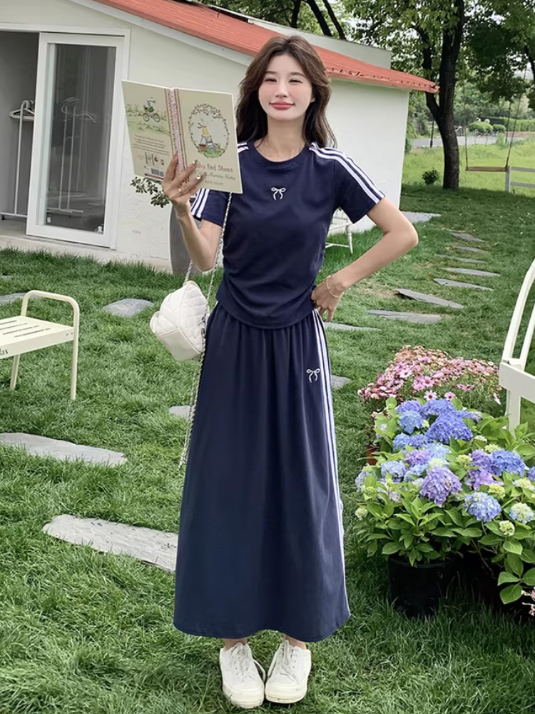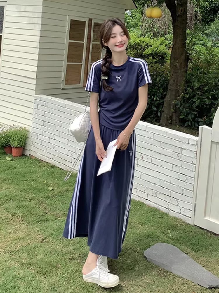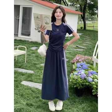 BY17037# 美式运动套装女夏季藏蓝色短袖半身裙学生宽松显瘦休闲两件套 服裝批發女裝批發服飾貨源