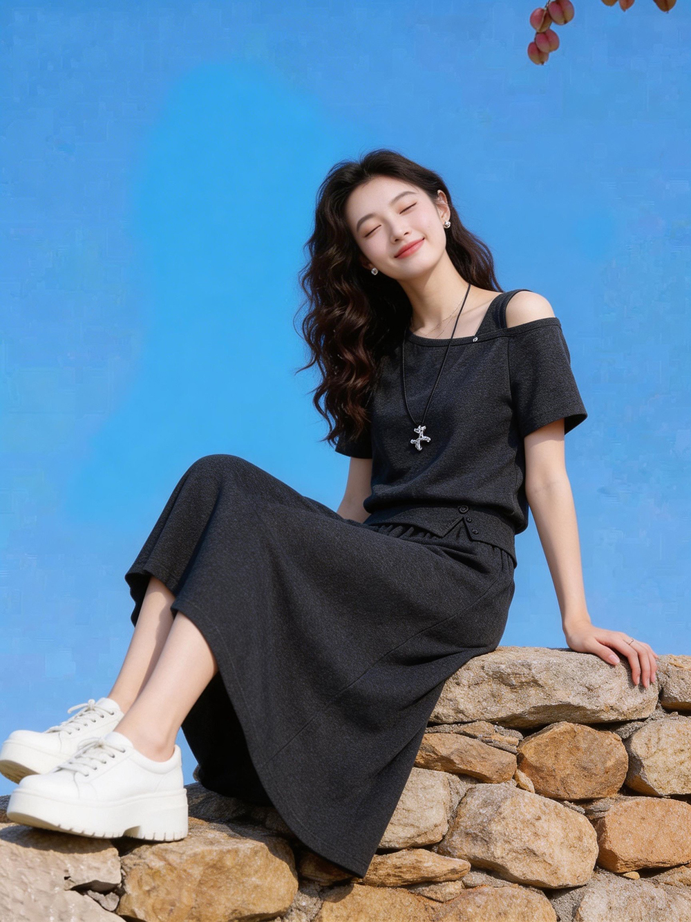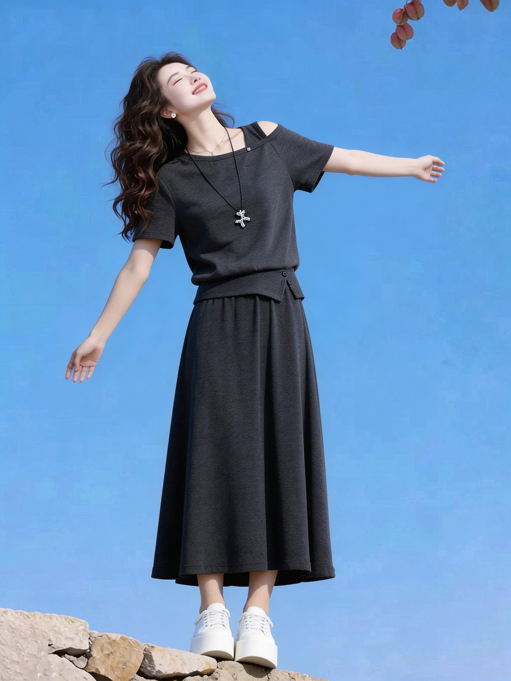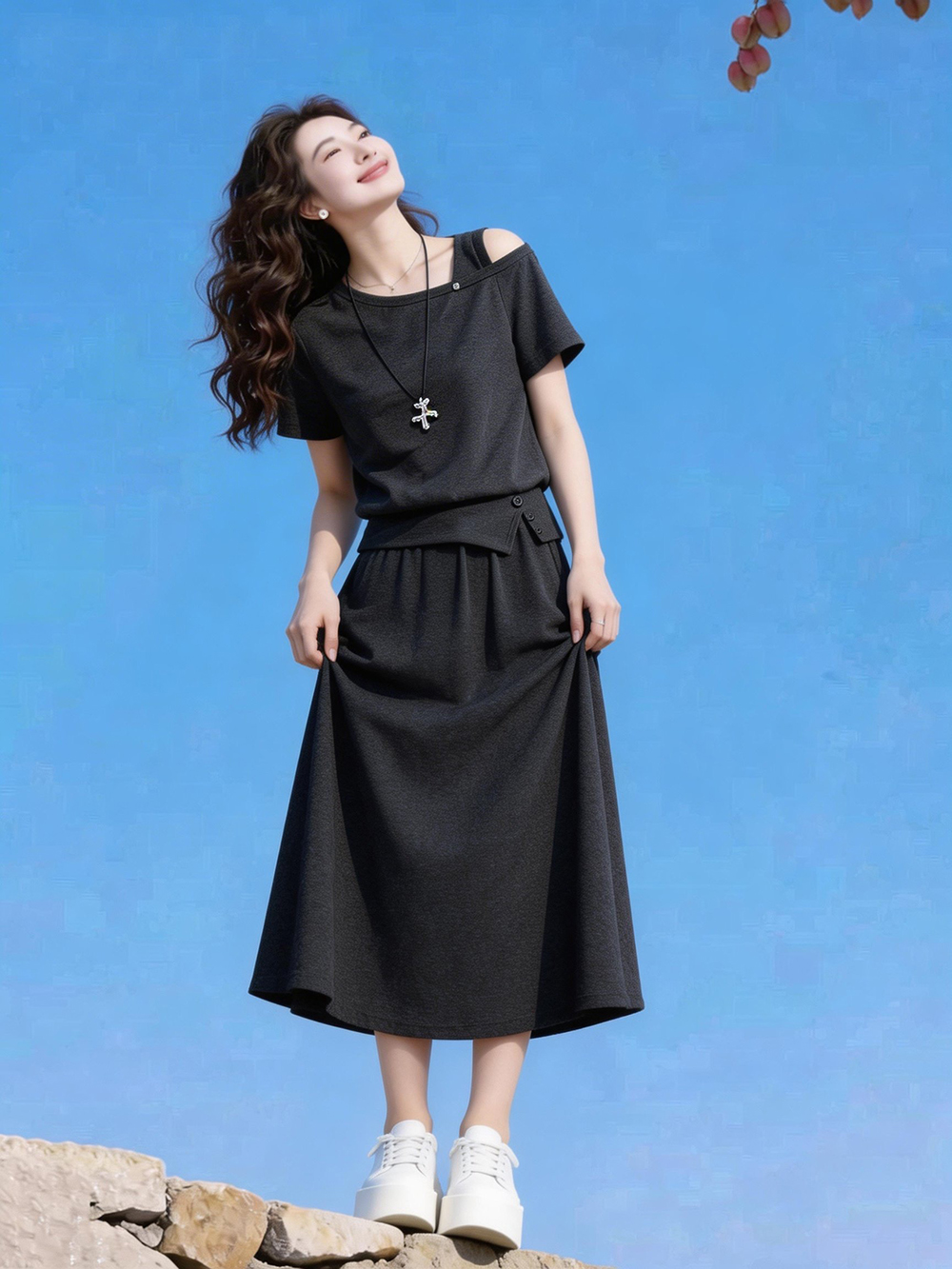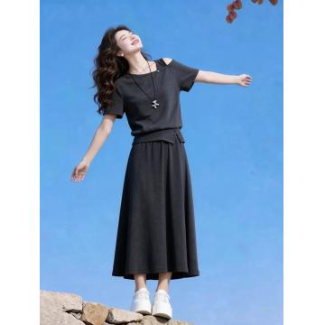 韩系简约深灰露肩短袖T恤+半身裙高腰长裙两件套装女夏季 服裝批發女裝批發服飾貨源