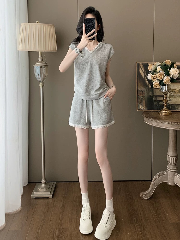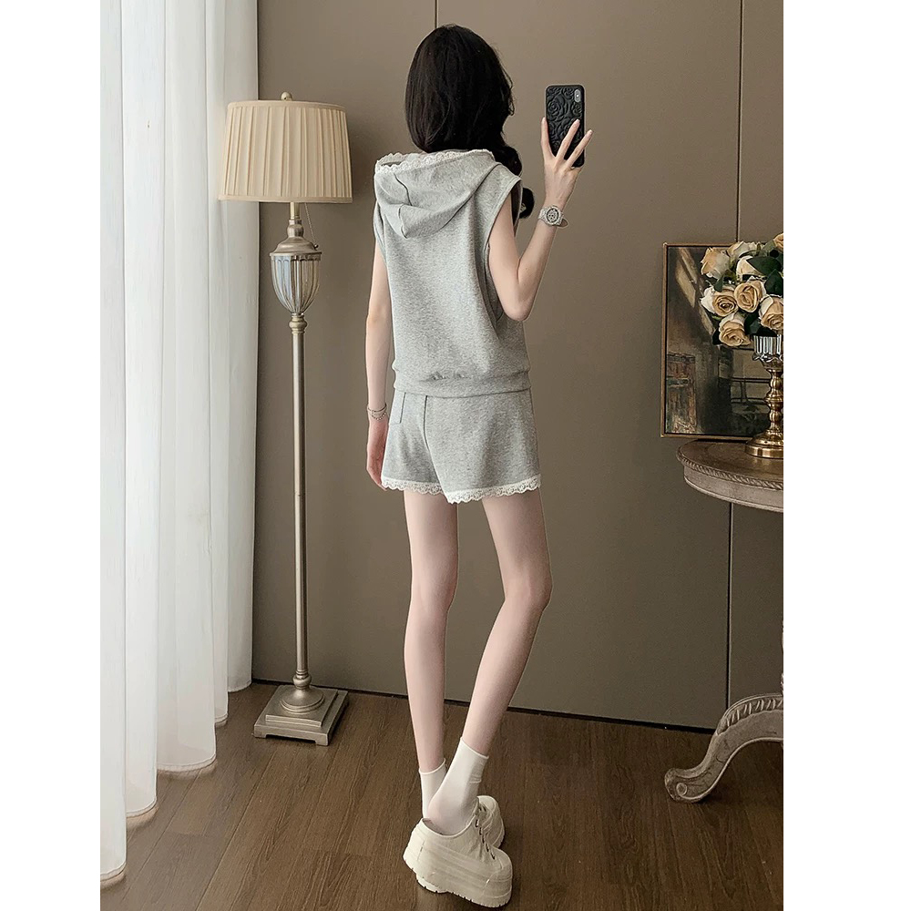 BY17060# 小个子穿搭休闲套装女夏季连帽蕾丝拼接灰色V领运动风短裤两件套 服裝批發女裝批發服飾貨源