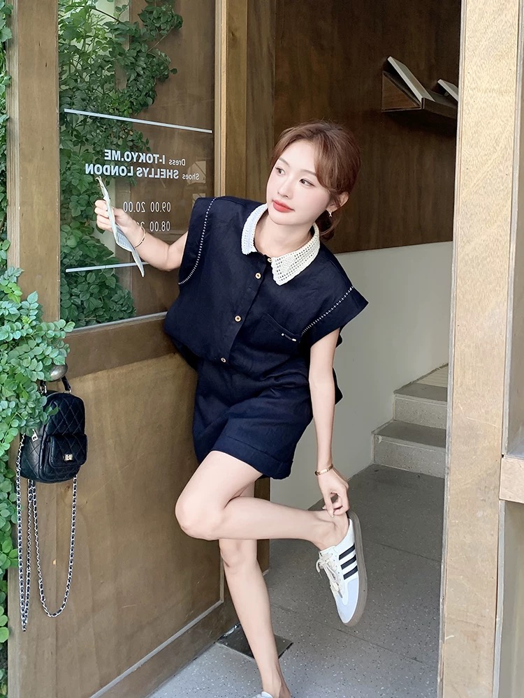 BY17062# 藏蓝色韩范时尚独特学院风衬衫套装女夏季新款阔腿短裤两件套 服裝批發女裝批發服飾貨源