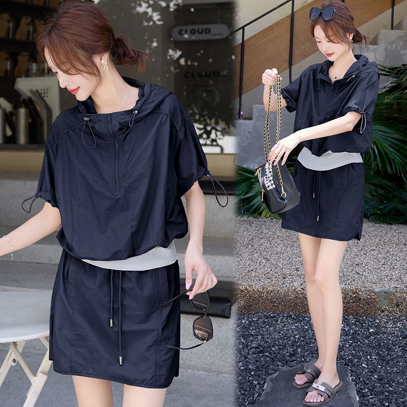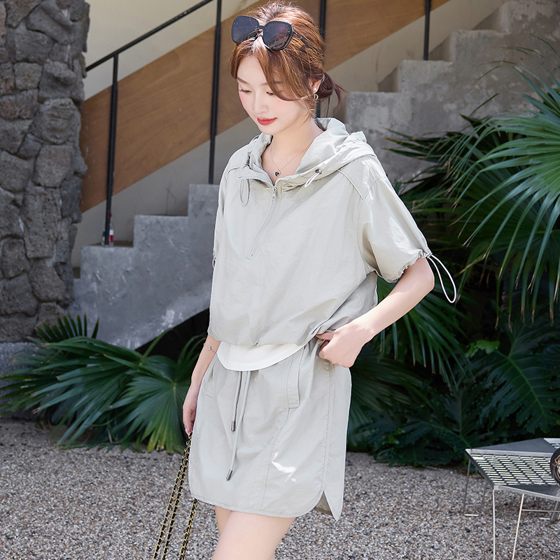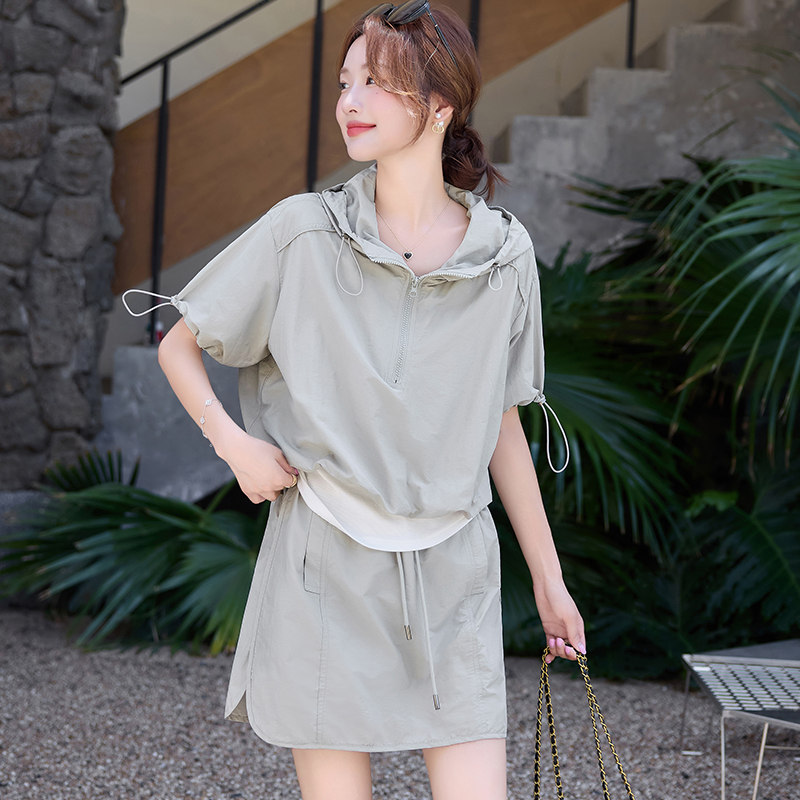 假两件短袖抽绳薄款上衣女新款夏季休闲运动半裙显瘦短款套装 服裝批發女裝批發服飾貨源
