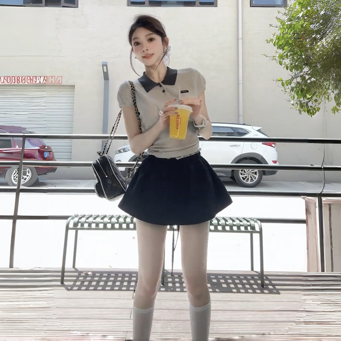 薄款毛衣t恤女夏polo衫+芭蕾风学院风花苞裙假两件松紧腰半身裙裤 服裝批發女裝批發服飾貨源