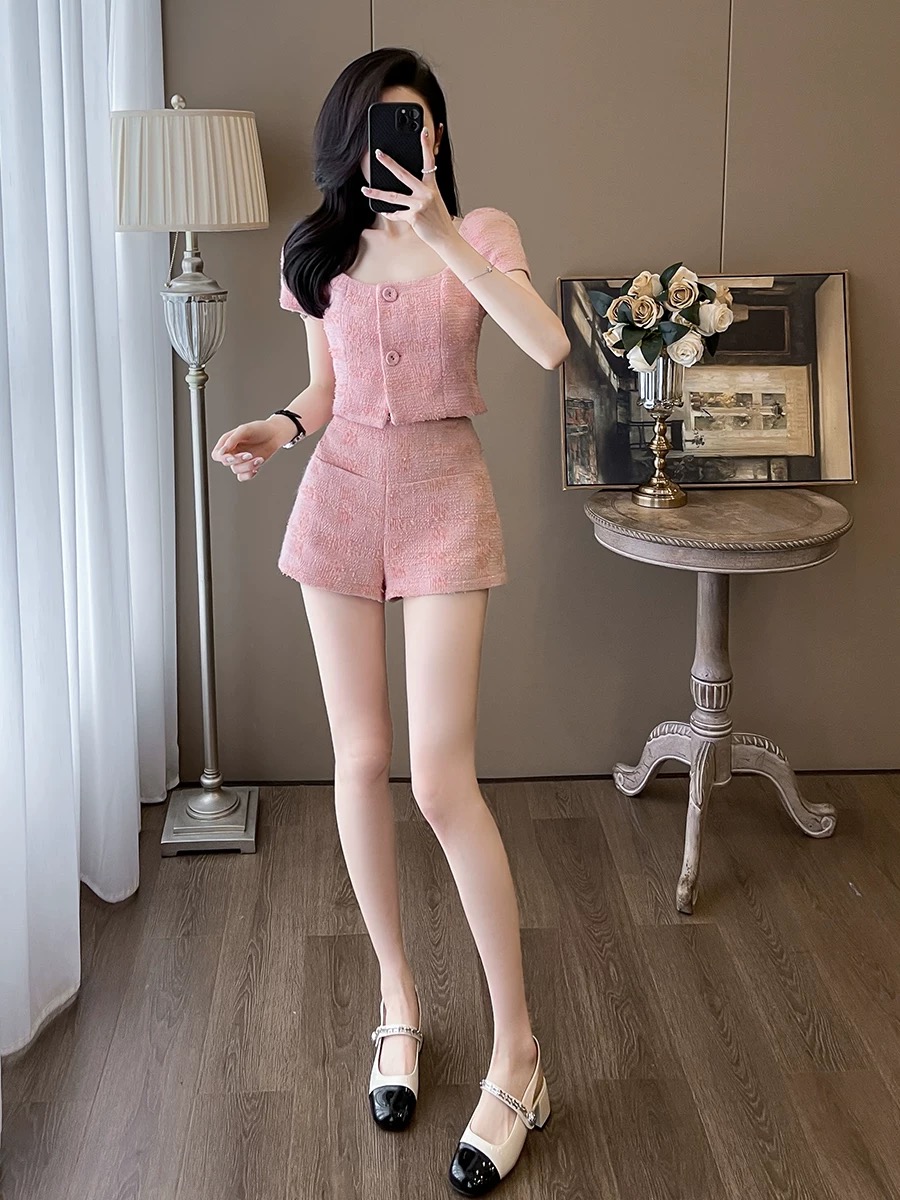 BY17079# 夏季名媛小个子活泼减龄气质炸街甜酷短裤小香风套装两件套高级感 服裝批發女裝批發服飾貨源