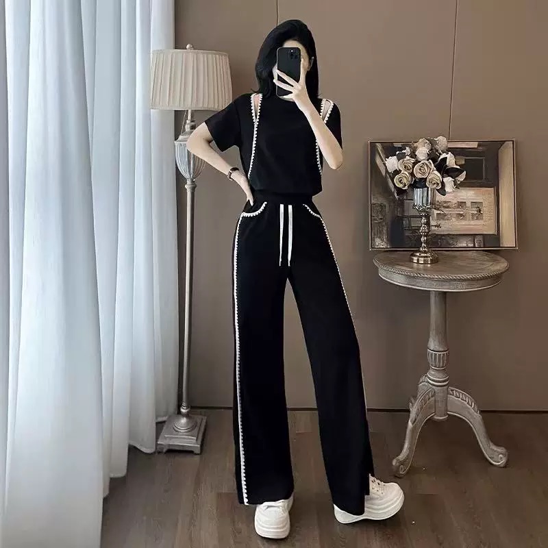 超火运动套装女夏季时尚休闲减龄显瘦露肩短袖阔腿长裤两件套 服裝批發女裝批發服飾貨源