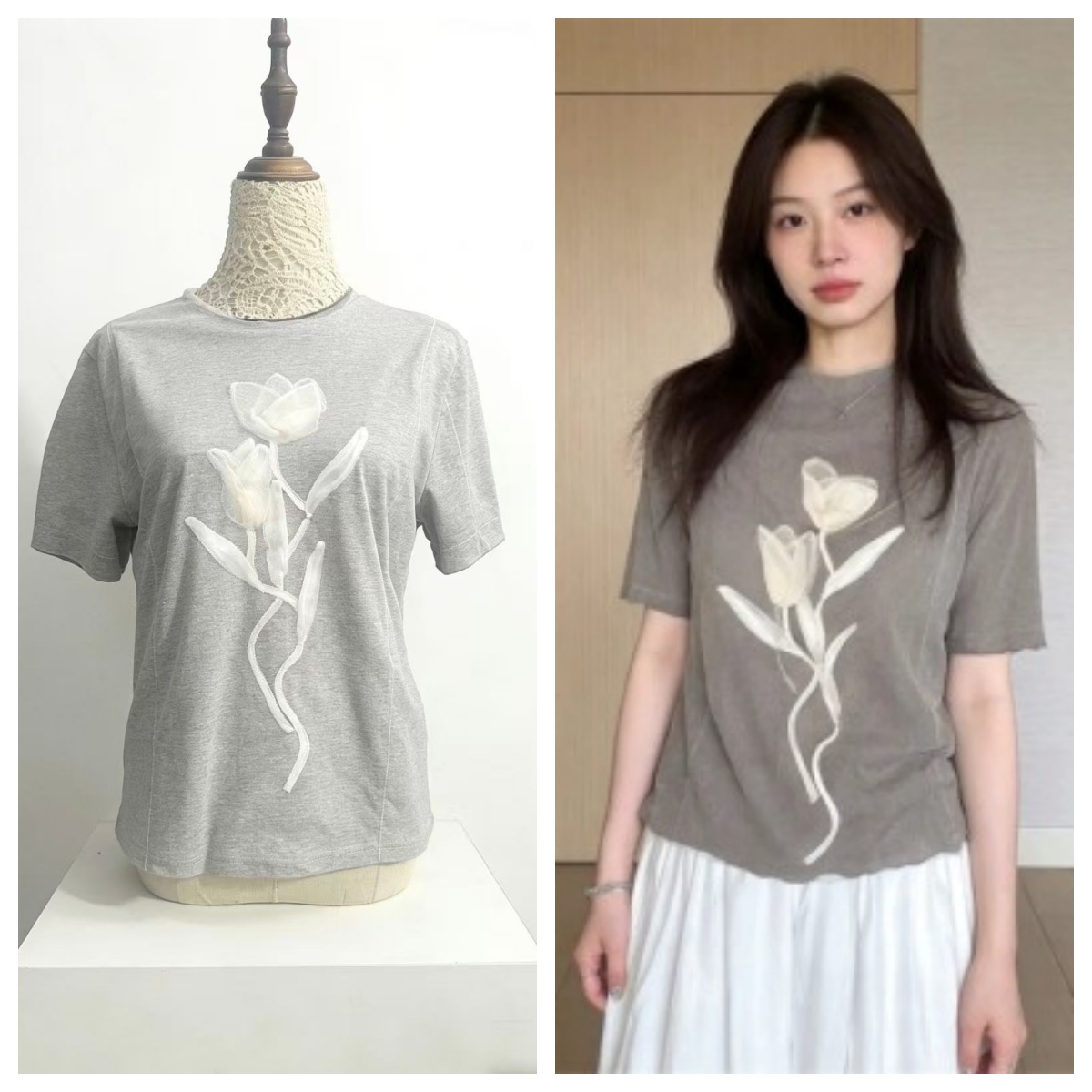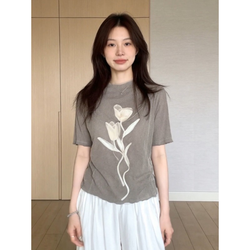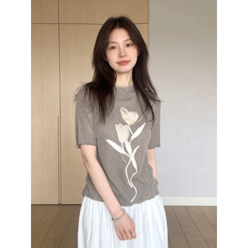 BY17165# 韩系超好看的花卉印花正肩短袖T恤女夏季新款上衣设计感小众 服裝批發女裝批發服飾貨源