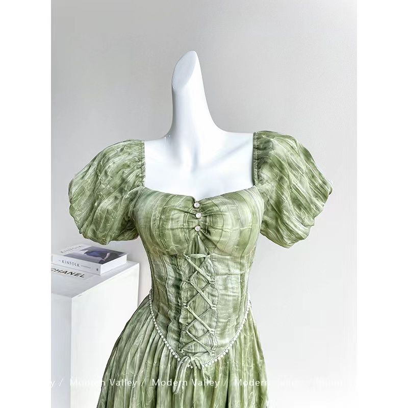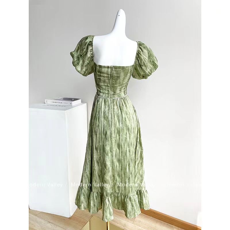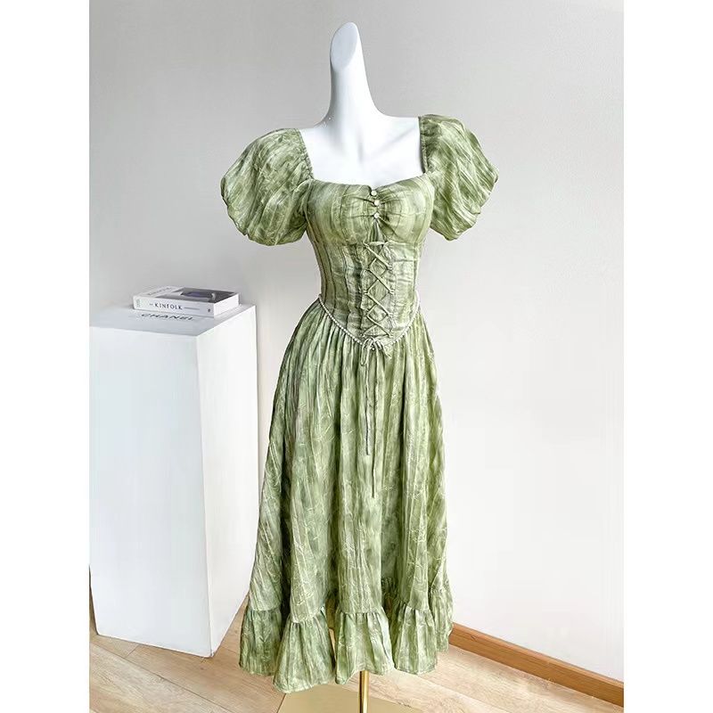 BY17167# 法式复古方领泡泡袖连衣裙女夏气质高级感初恋在逃公主连衣裙 服裝批發女裝批發服飾貨源