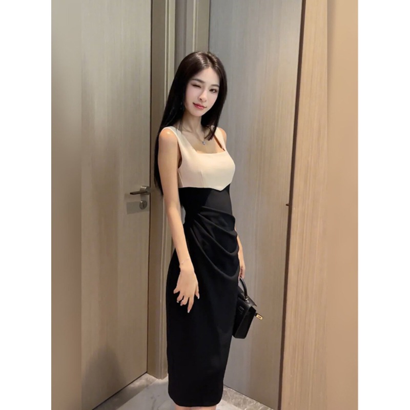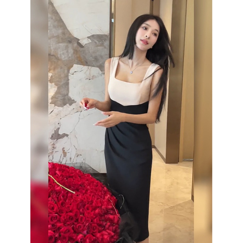 赫本风高级感吊带连衣裙女夏季设计感拼接背心长裙性感开叉包臀裙 服裝批發女裝批發服飾貨源