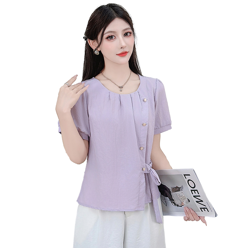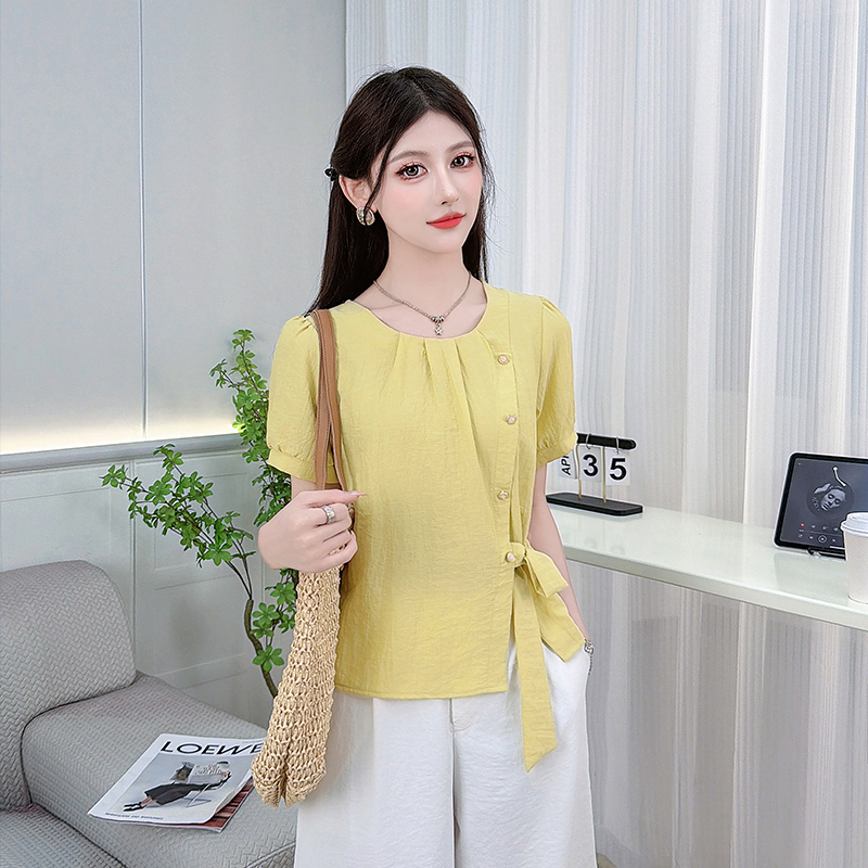 时尚衬衫女夏季新款洋气宽松显瘦设计感百搭系带收腰短袖上衣 服裝批發女裝批發服飾貨源