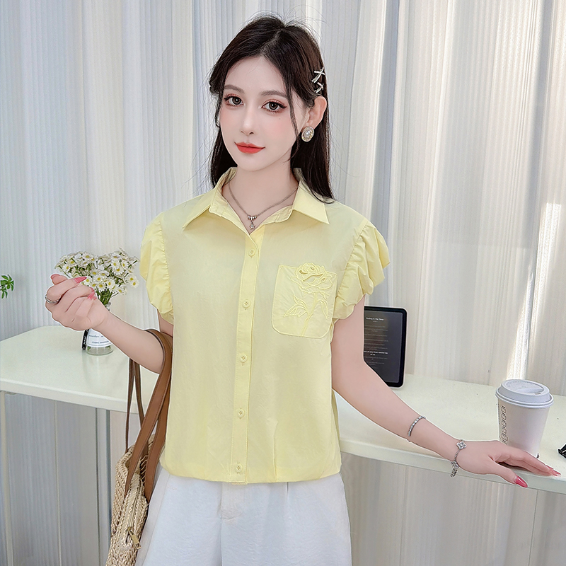 时尚休闲短袖纯棉衬衫女士夏装新款百搭绣花口袋衬衣宽松上衣 服裝批發女裝批發服飾貨源