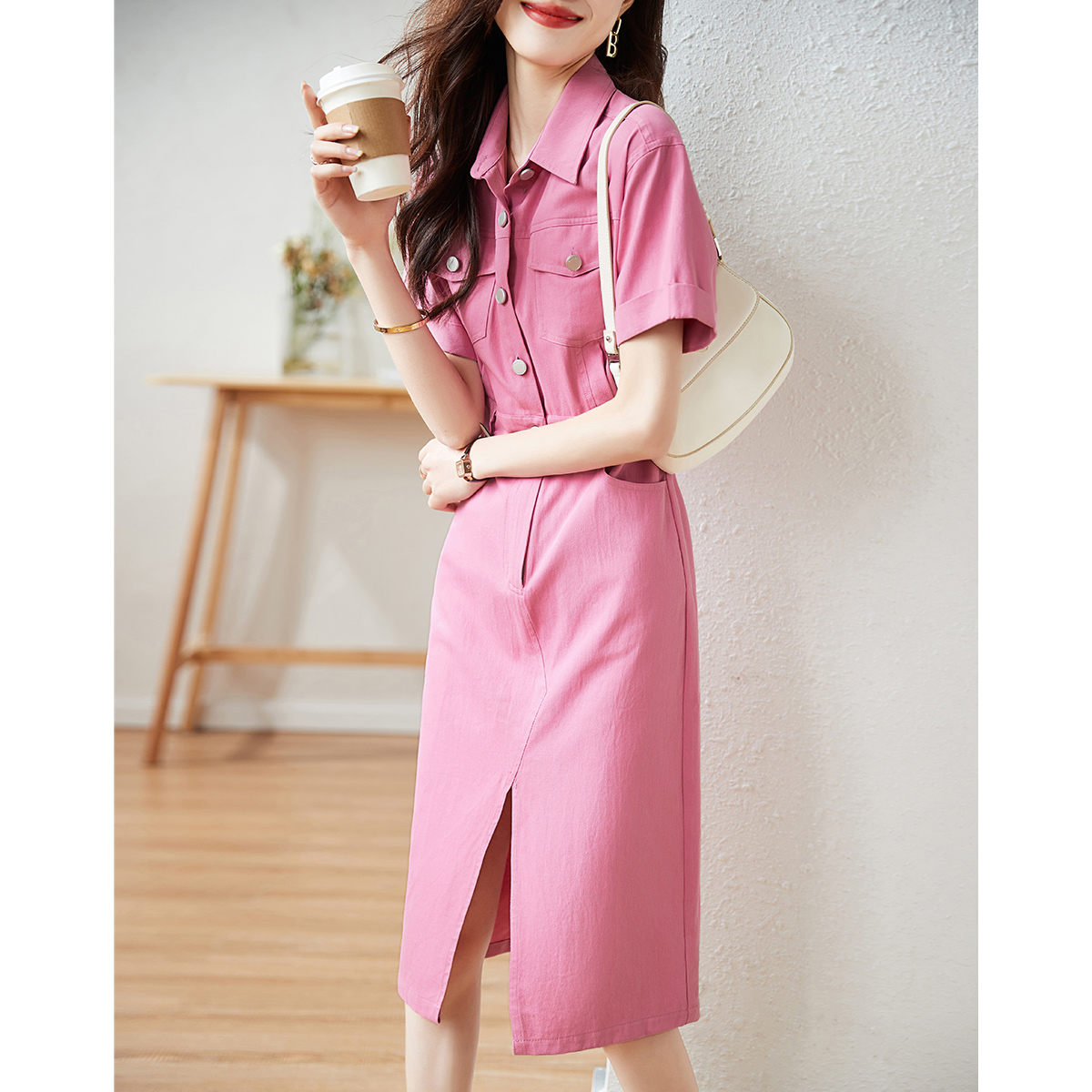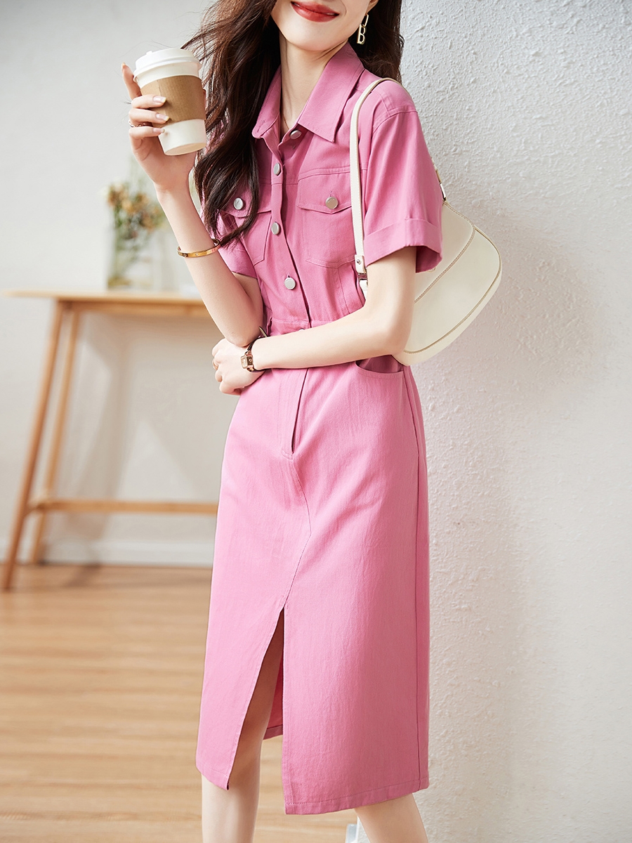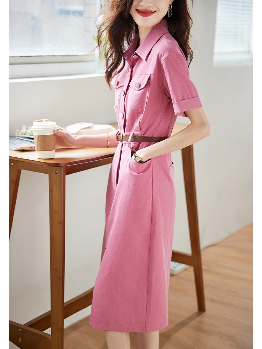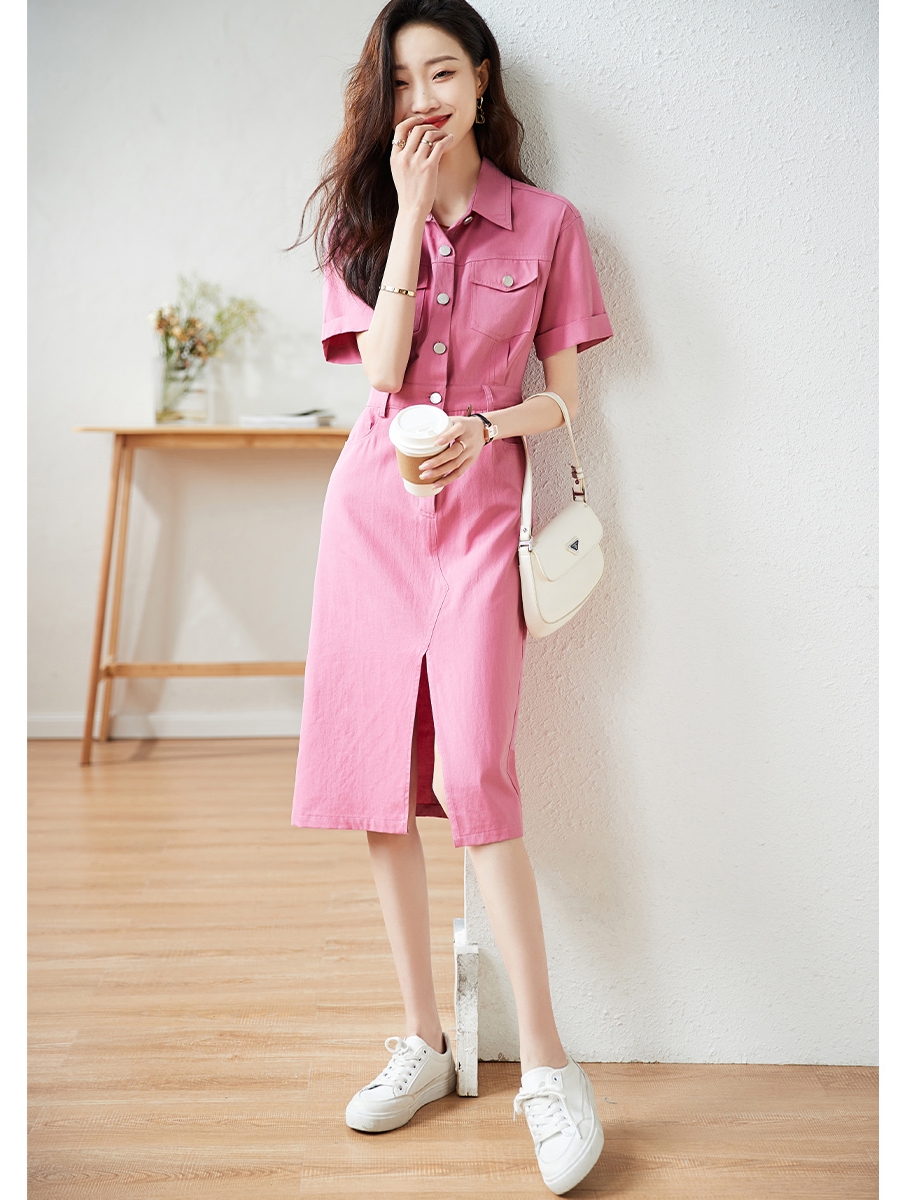 夏新款法式设计感小众Polo领粉色休闲衬衫连衣裙女 服裝批發女裝批發服飾貨源