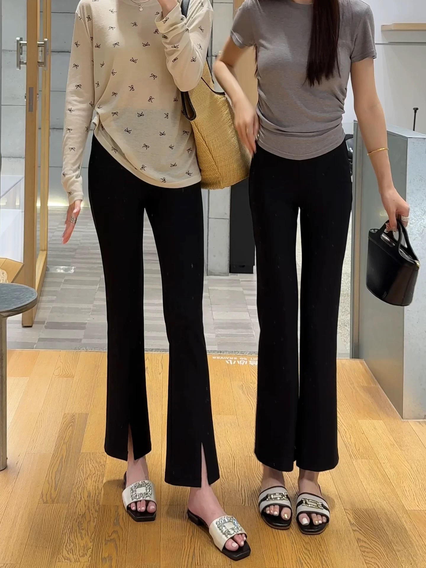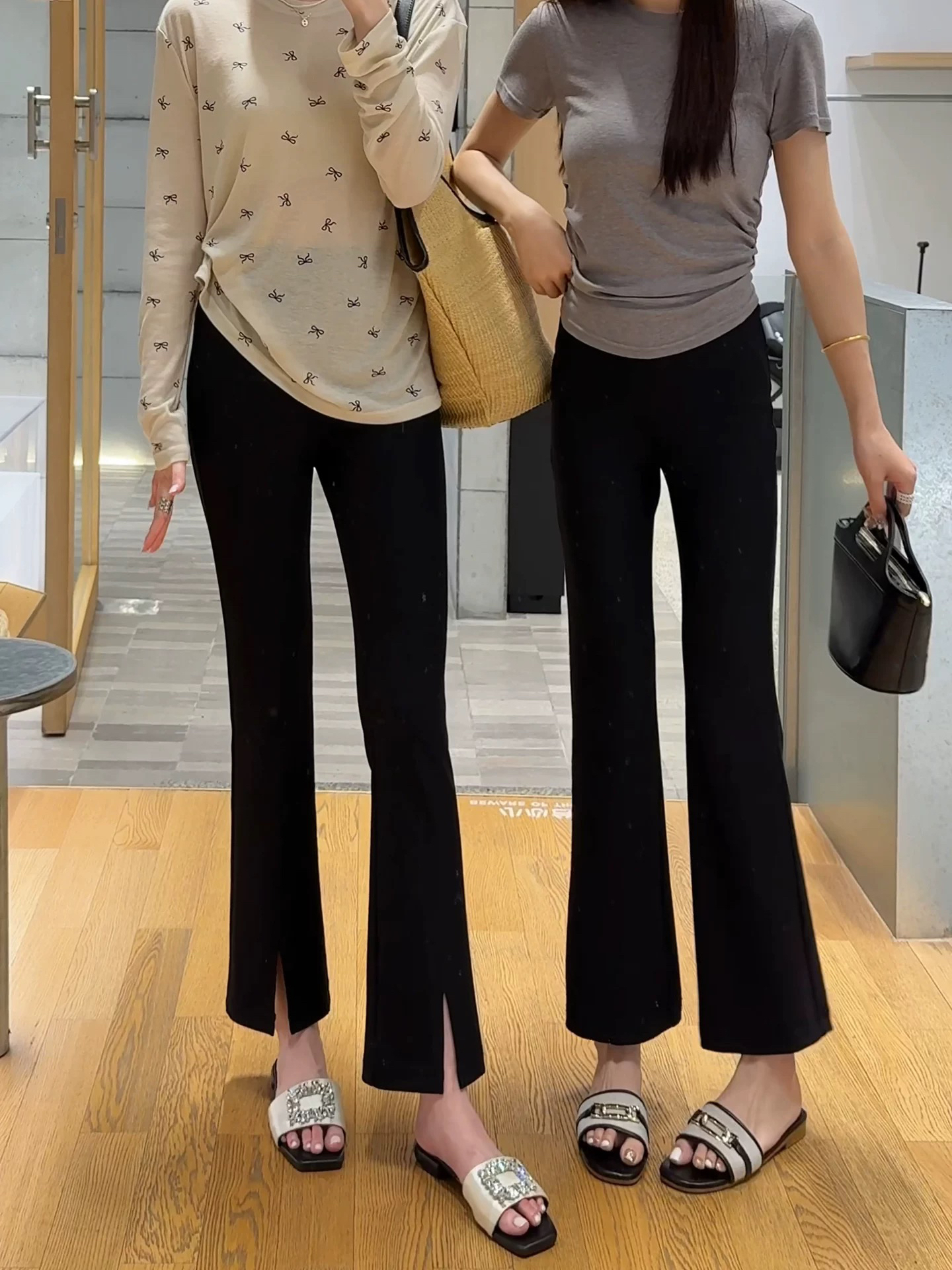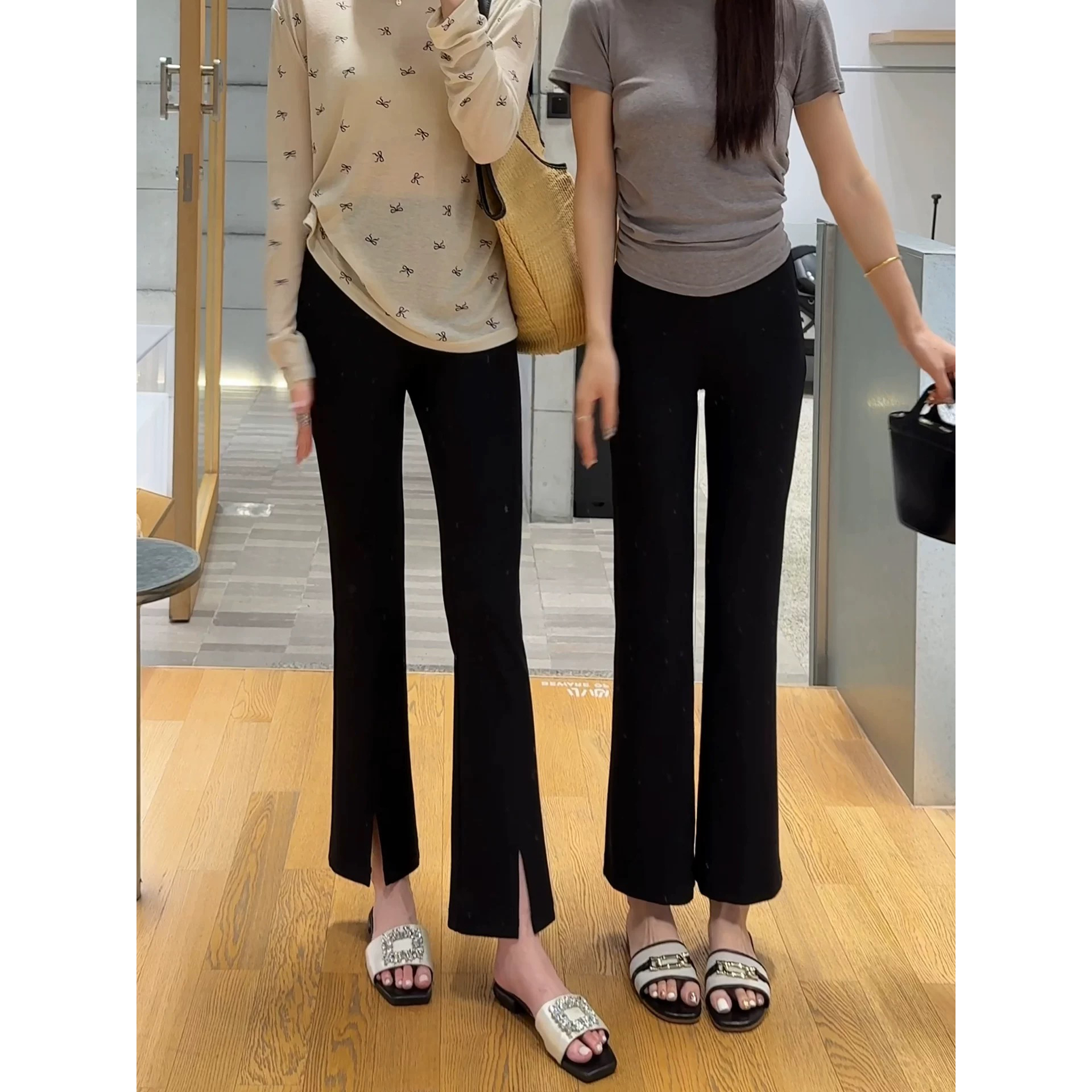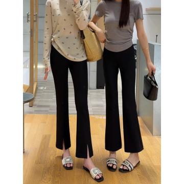 BY17901# 黑色冰丝九分开叉微喇叭裤女新款春夏季垂感薄显瘦休闲西装裤 服裝批發女裝批發服飾貨源