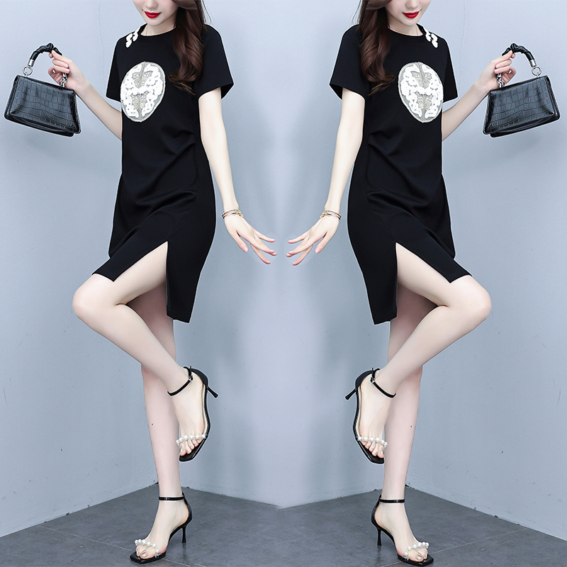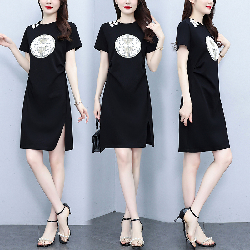 BY17908# 大码女装中国风盘扣T恤夏季新款时尚休闲短袖开叉连衣裙 服裝批發女裝批發服飾貨源