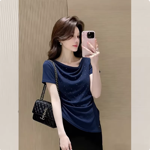 BY17987# 御姐风荡领洋气钉珠褶皱短袖T恤女夏季新款不规则辣妹上衣潮 服裝批發女裝批發服飾貨源