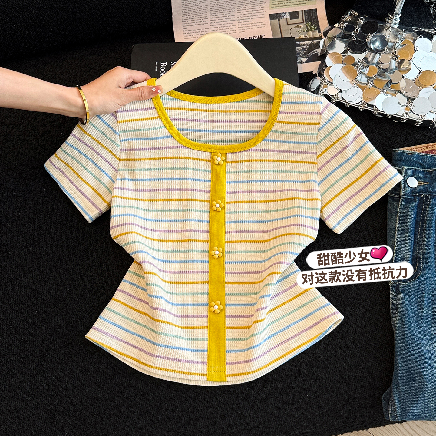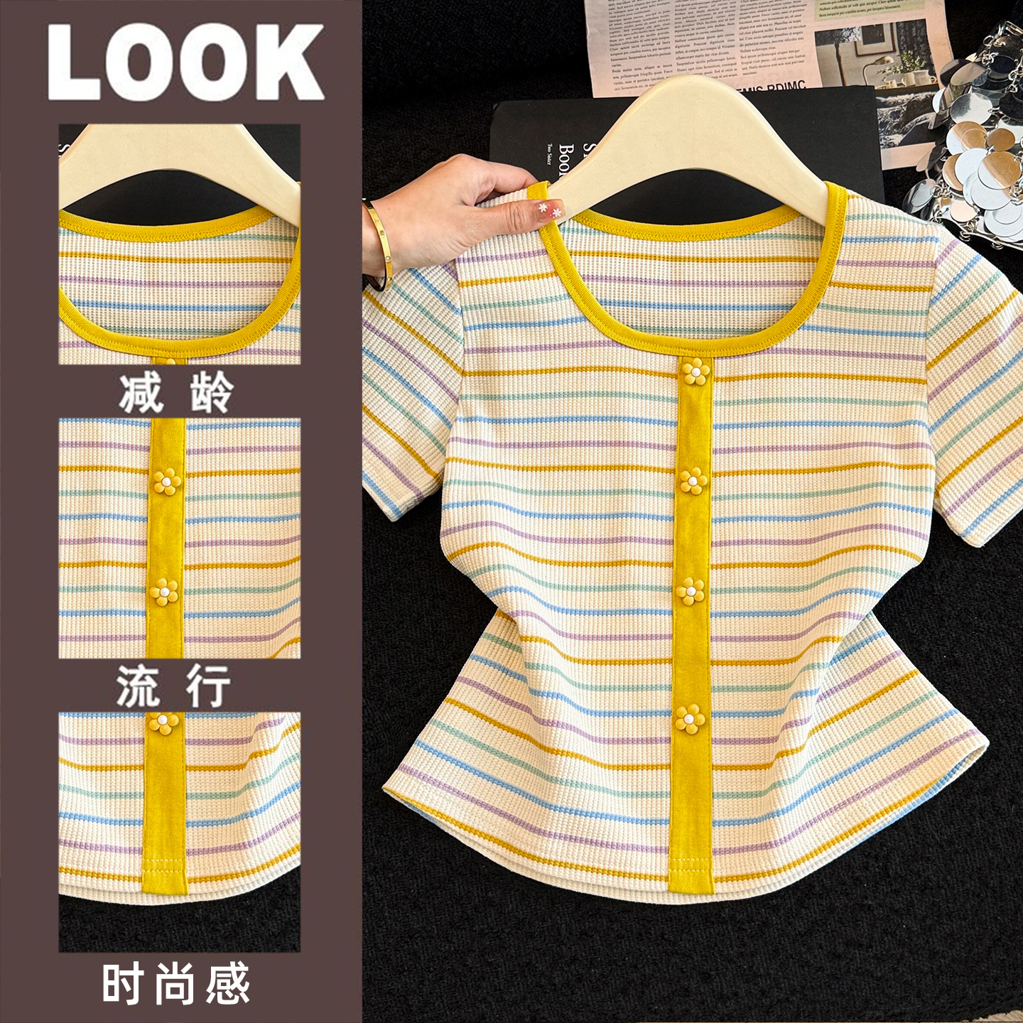 BY18013# 正肩方领条纹短袖t恤女夏季新款修身显瘦小个子短款锁骨上衣 服裝批發女裝批發服飾貨源