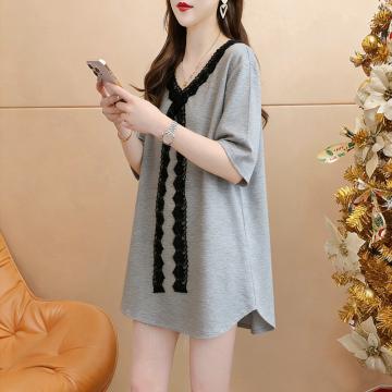 BY18018# 纯棉夏季宽松中长款蕾丝花边V领短袖T恤女 服裝批發女裝批發服飾貨源