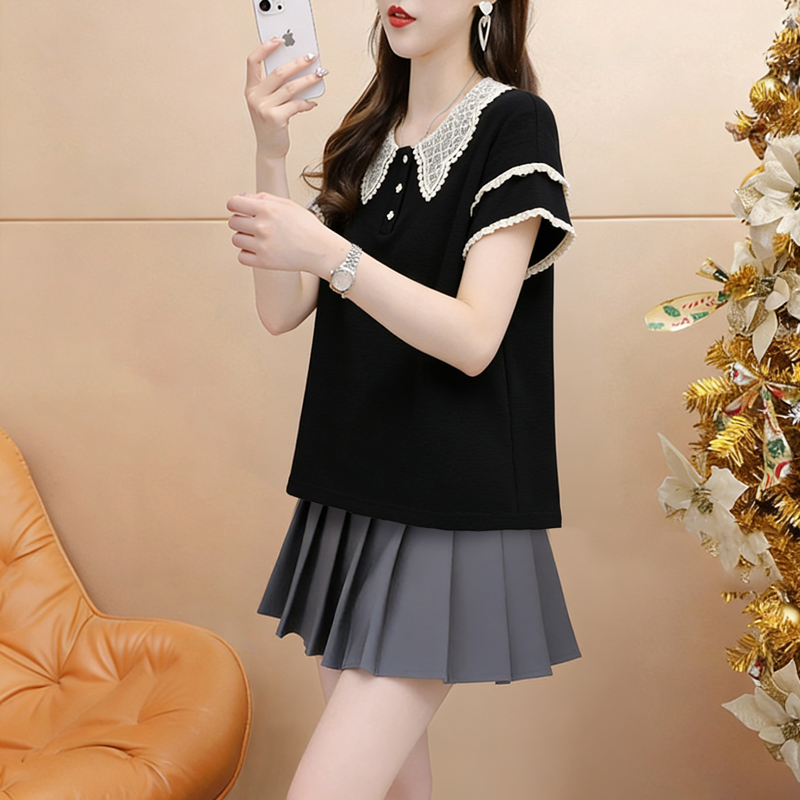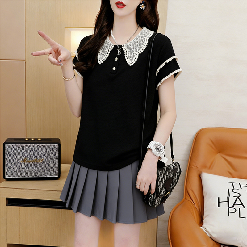 BY18020# 夏季宽松大码蕾丝娃娃领短袖T恤女 服裝批發女裝批發服飾貨源
