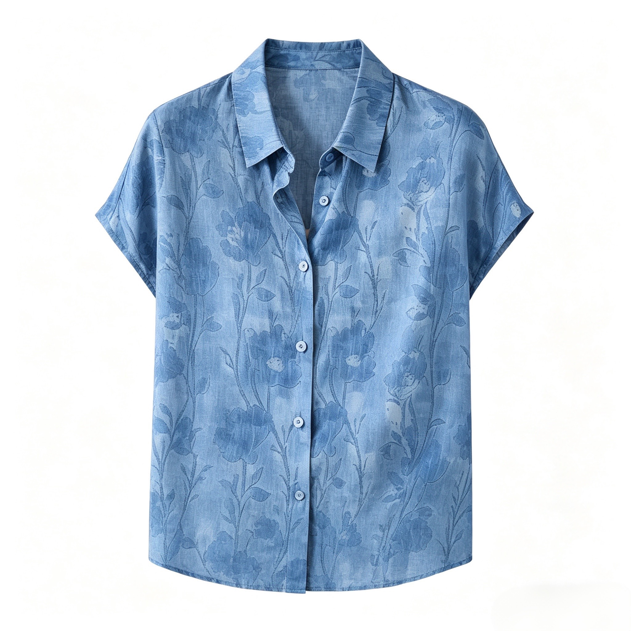 BY18133# 夏季新款时尚流行气质宽松清爽蓝色印花桑蚕丝衬衫女上衣薄款 服裝批發女裝批發服飾貨源