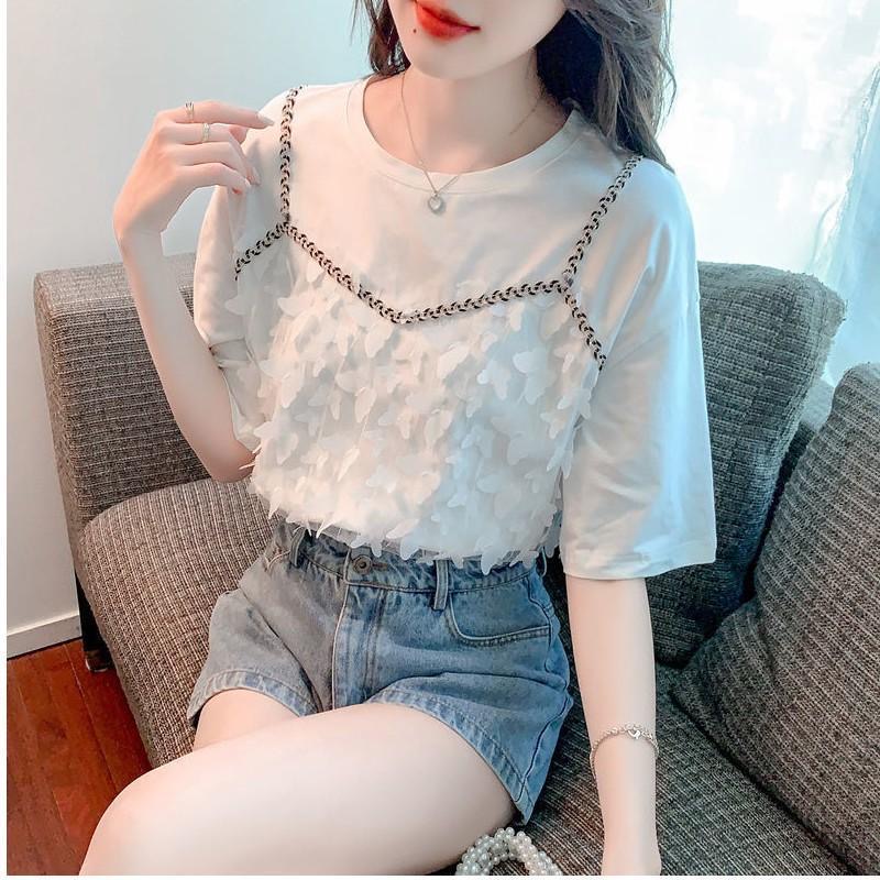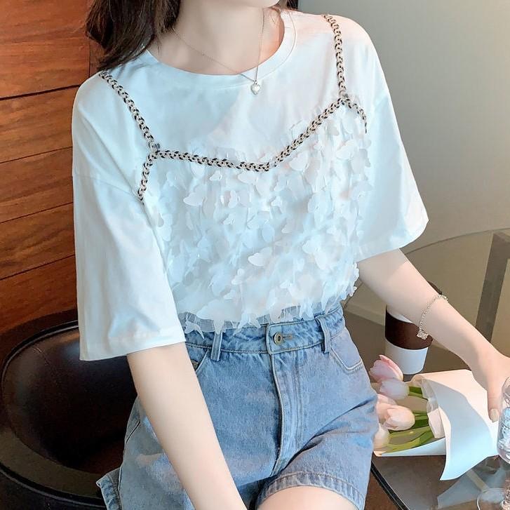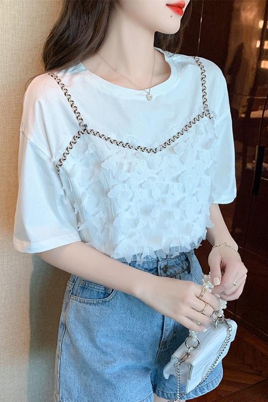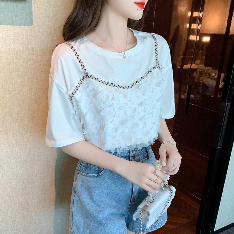 BY18216# 假两件夏季白色短袖T恤韩版原宿风个性小众设计感圆领上衣ins 服裝批發女裝批發服飾貨源