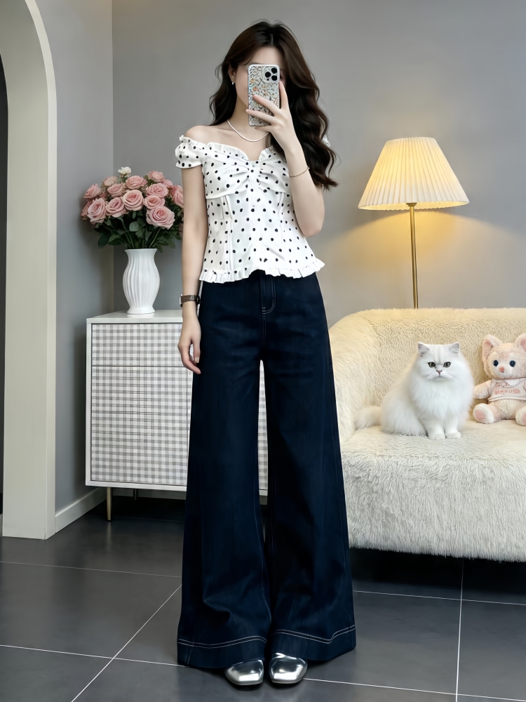 BY18335# 夏日穿搭一整套女新款韩系ins设计感波点上衣阔腿牛仔裤套装 服裝批發女裝批發服飾貨源