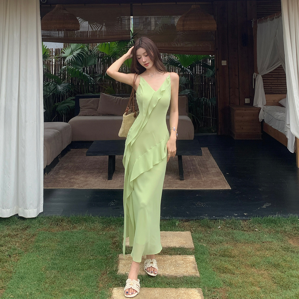 BY18346# 夏季新款V领度假裙斜裁荷叶边碎花吊带连衣裙鱼尾长裙 服裝批發女裝批發服飾貨源