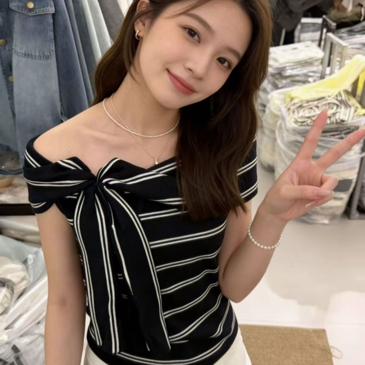 BY18372# 新款韩系纯欲风一字肩条纹针织衫女夏季露肩百搭减龄气质上衣 服裝批發女裝批發服飾貨源