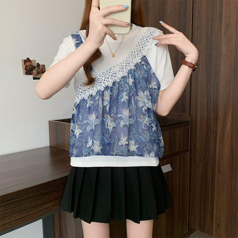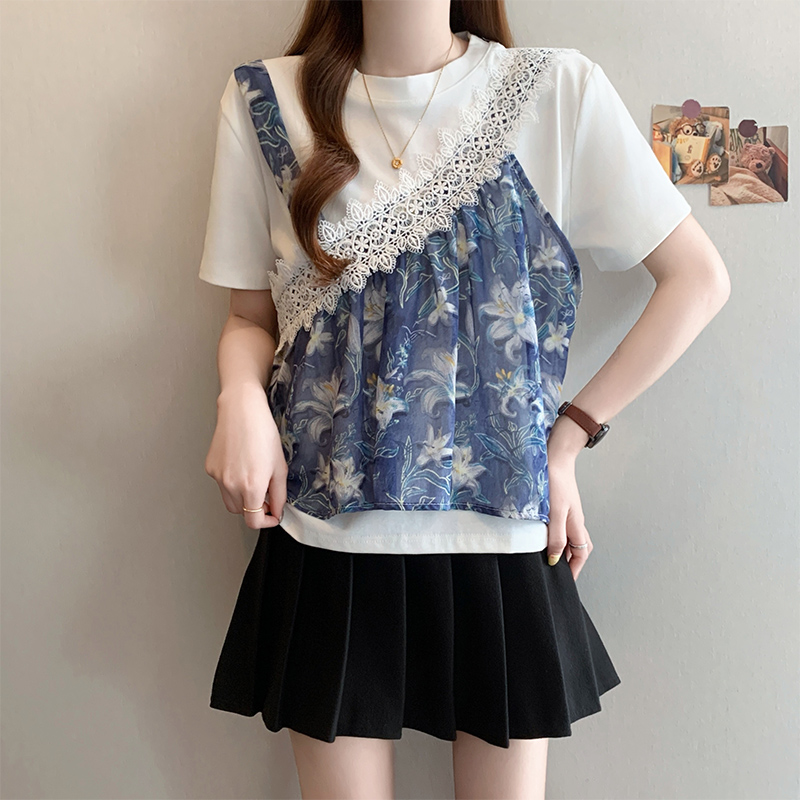 BY18428# 夏新款大码时尚减龄蕾丝拼接宽松显瘦百搭假两件T恤上衣 服裝批發女裝批發服飾貨源