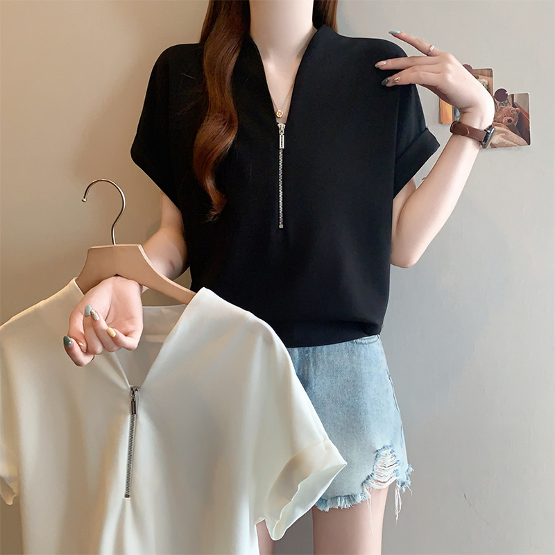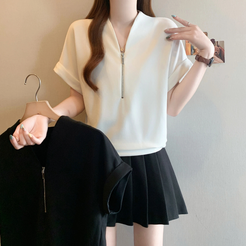 Home > 短袖T恤 > BY18430# 夏季新款大码时尚休闲百搭拉链设计宽松显瘦别致T恤上衣 服裝批發女裝批發服飾貨源
