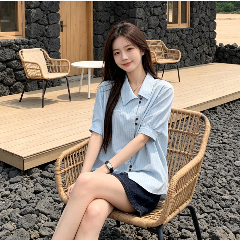BY18449# 法式气质条纹斜襟领短袖设计感衬衫女装夏季新款别致休闲上衣 服裝批發女裝批發服飾貨源