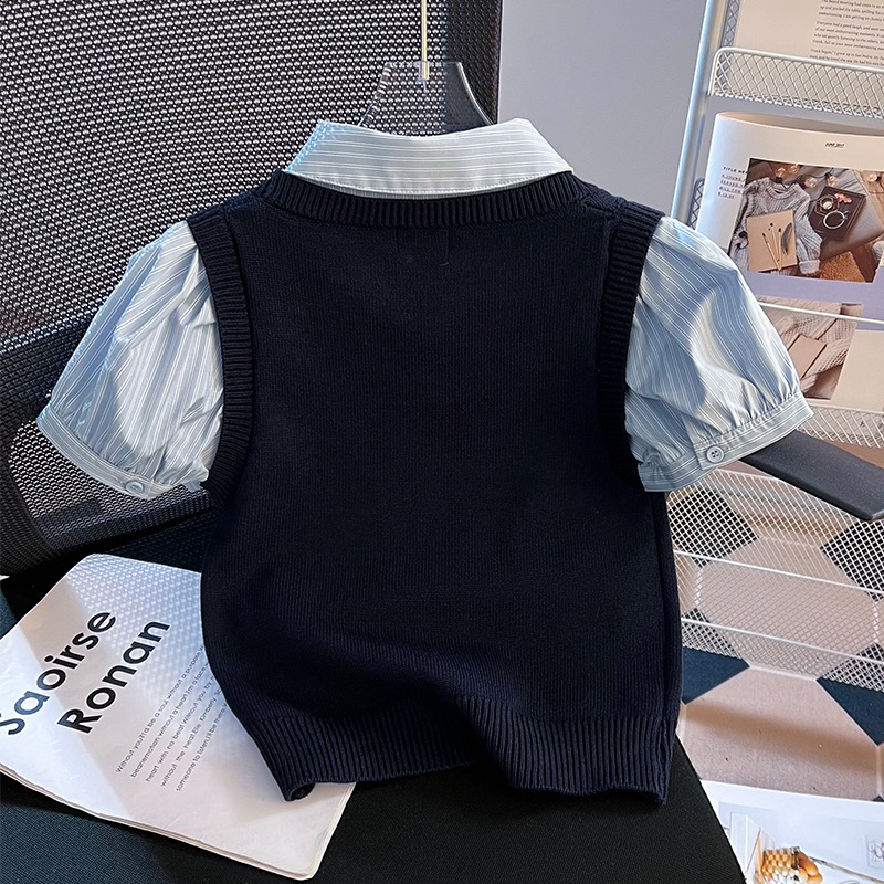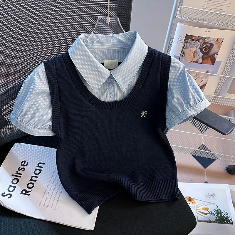BY18484# 小众设计感学院风高腰短款假两件拼接短袖衬衫女上衣 服裝批發女裝批發服飾貨源