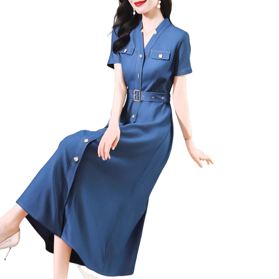 BY18617# 气质高级感穿搭夏季复古通勤工装风蓝色含棉短袖衬衫式连衣裙 服裝批發女裝批發服飾貨源
