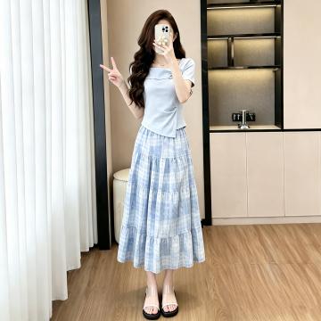 BY18673# 时尚套装女遮肉显瘦气质百搭设计感T恤加碎花半身裙两件套 服裝批發女裝批發服飾貨源