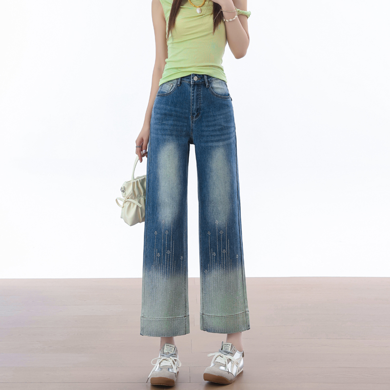 BY18968# 蓝色拼色直筒牛仔裤女春夏宽松薄款小个子九分弹力烟管裤子女 服裝批發女裝批發服飾貨源