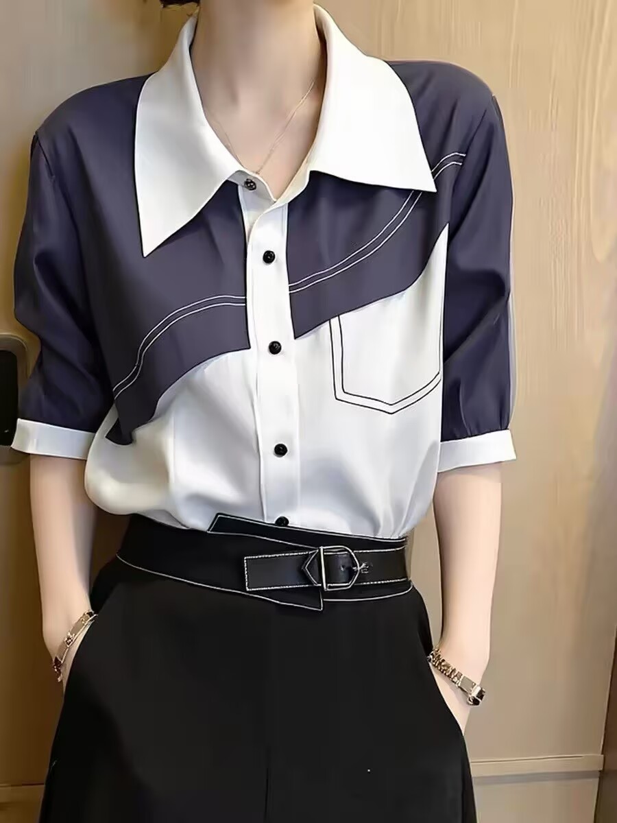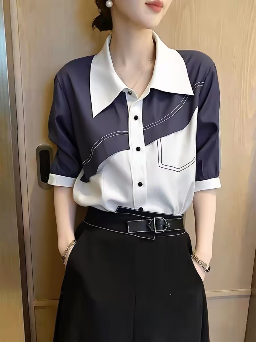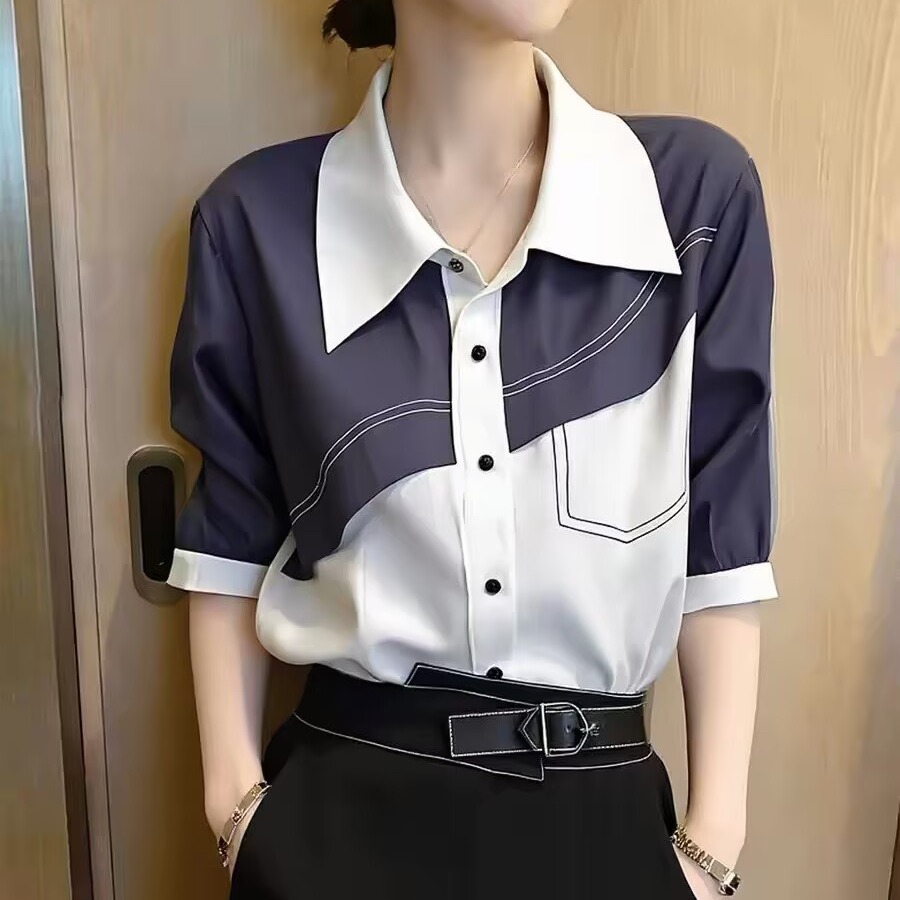 BY18996# 复古拼接风撞色衬衫女夏季新款短袖翻领设计感洋气减龄上衣 服裝批發女裝批發服飾貨源