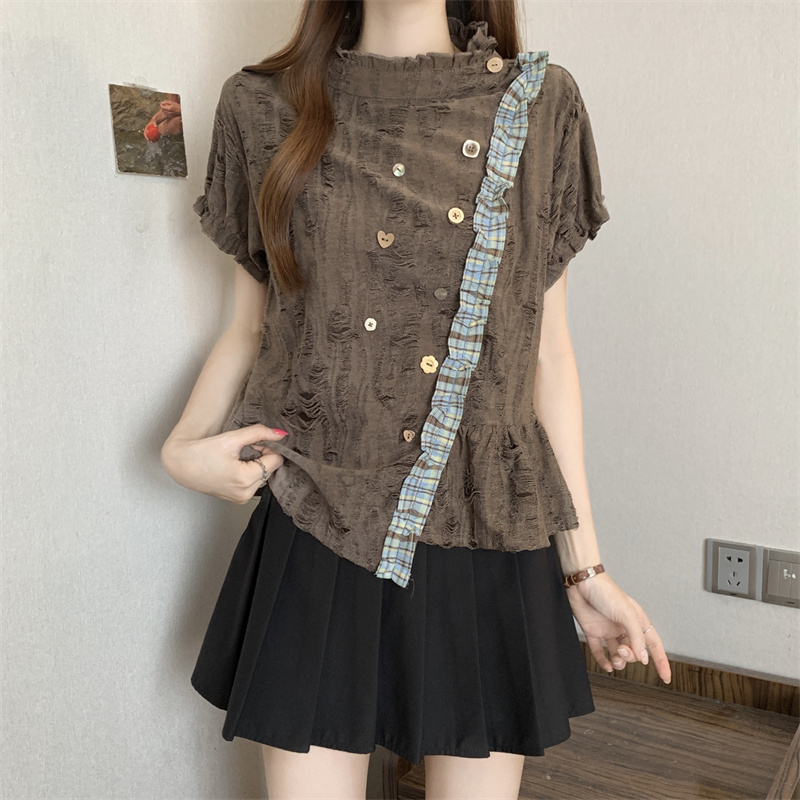 BY19367# 大码胖MM新款气质甜美复古小众设计棕色短袖上衣 服裝批發女裝批發服飾貨源