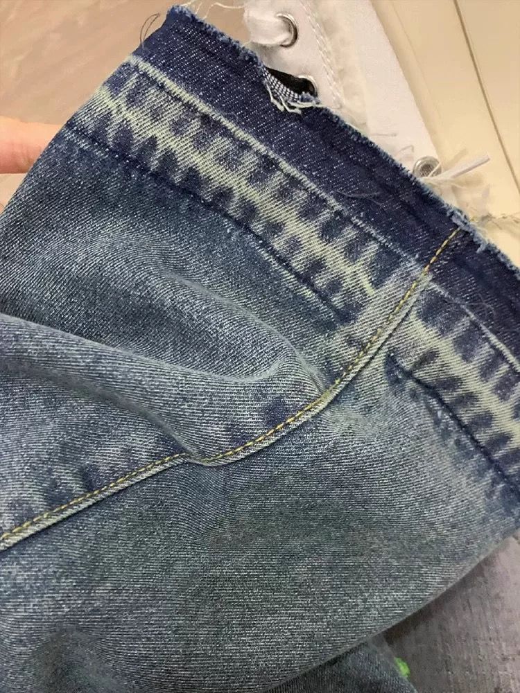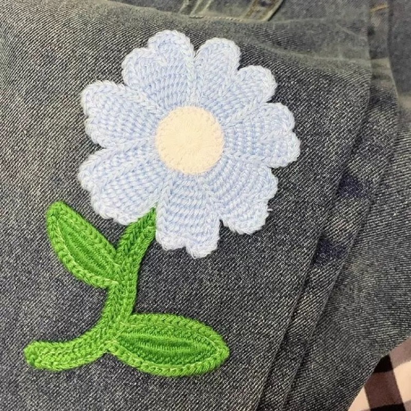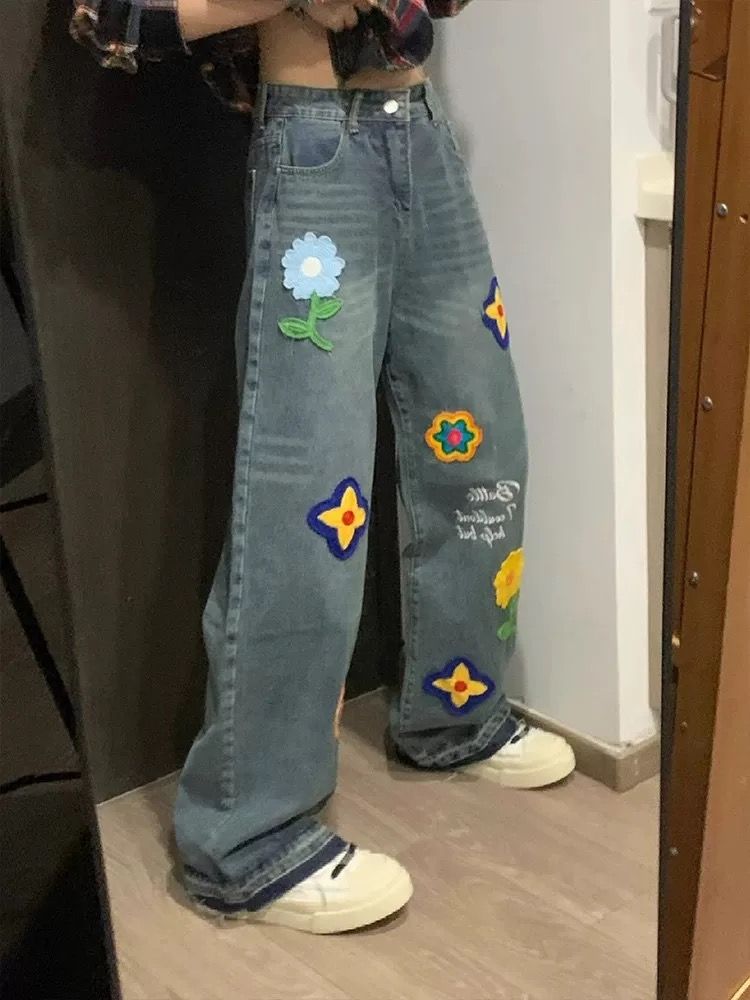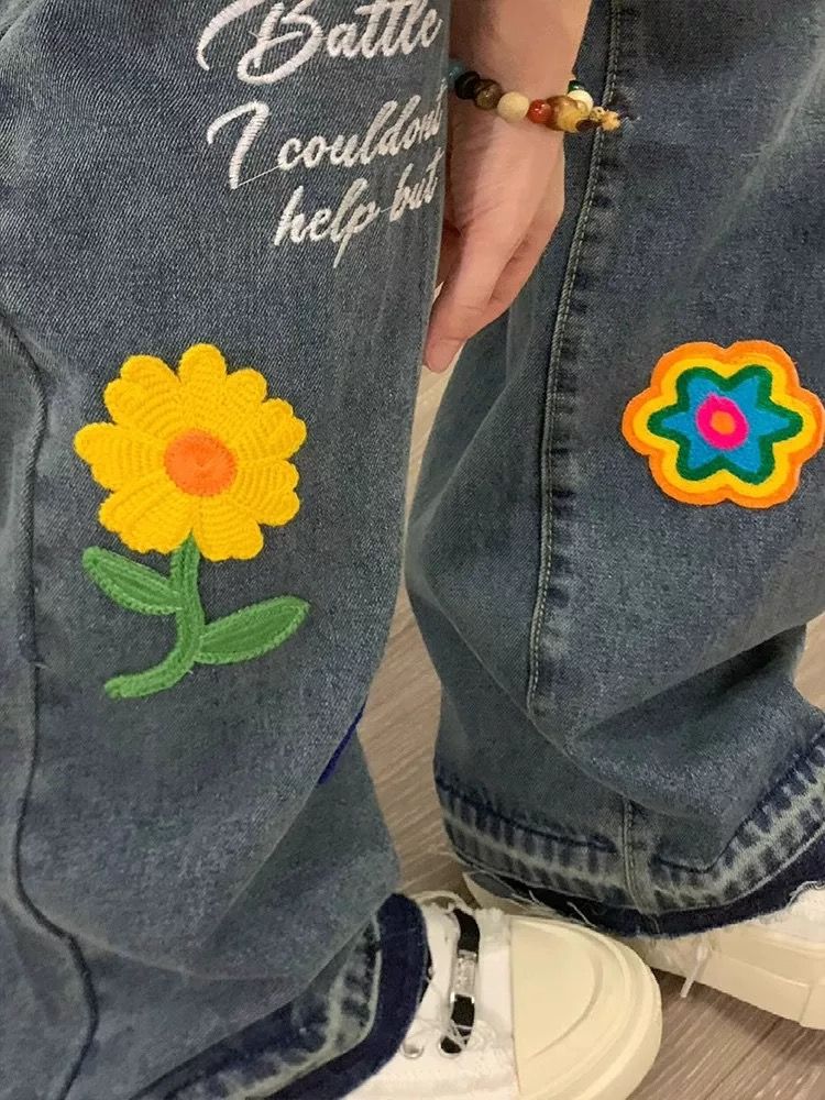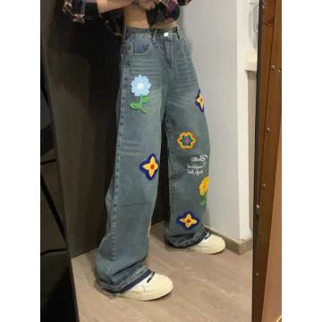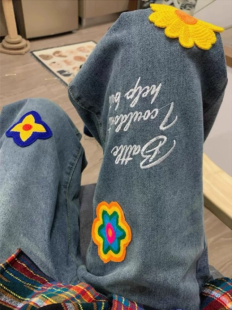 FA43513# 美式创意花朵字母刺绣牛仔裤女秋冬宽松显瘦直筒阔腿拖地长裤 服裝批發女裝批發服飾貨源