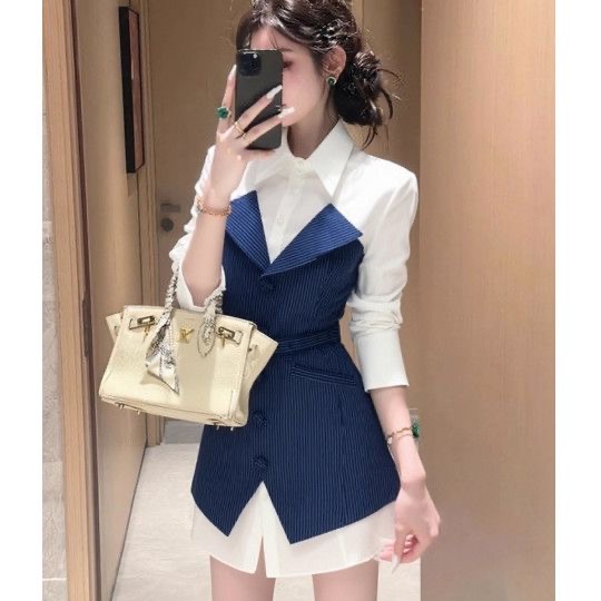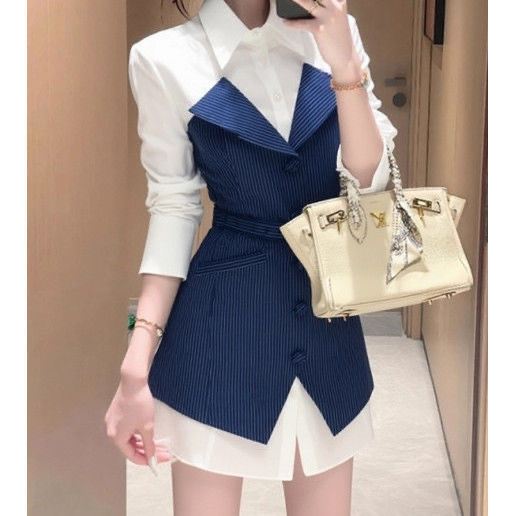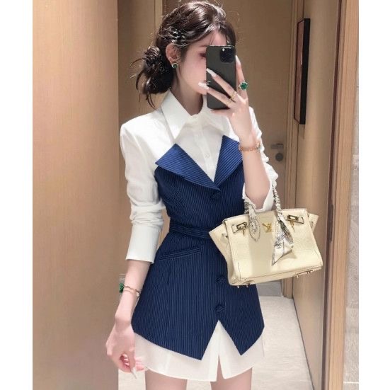 FA43519# 职场正式穿搭漂亮冷淡系巨好看设计感小众条纹假两件衬衫连衣裙秋 服裝批發女裝批發服飾貨源