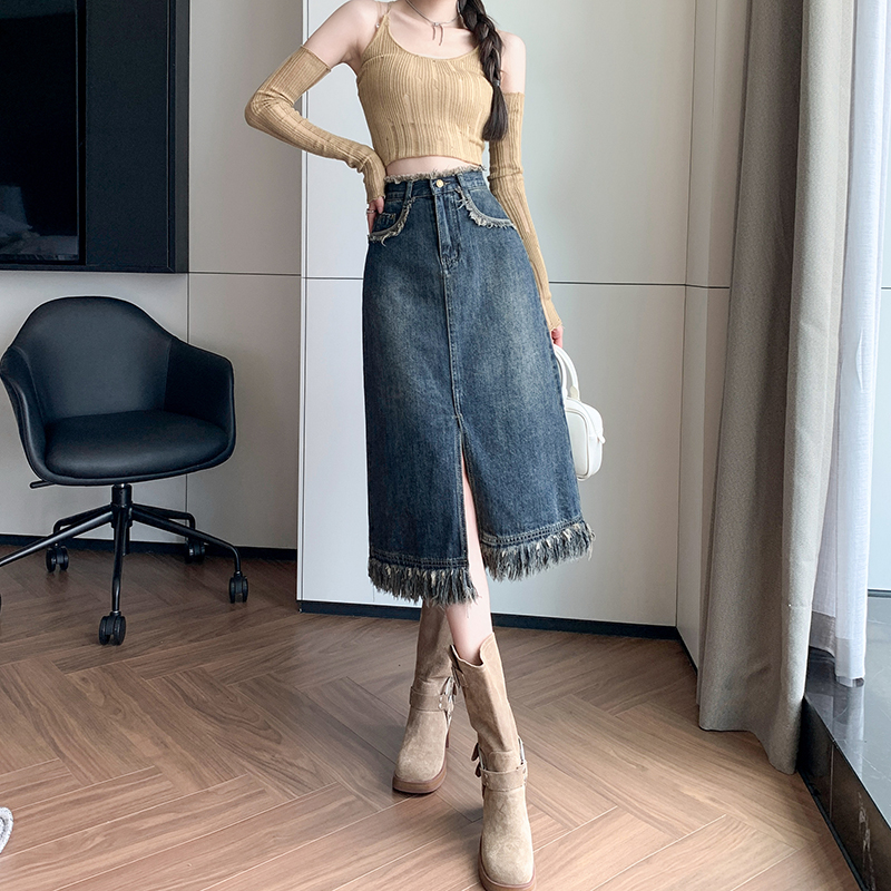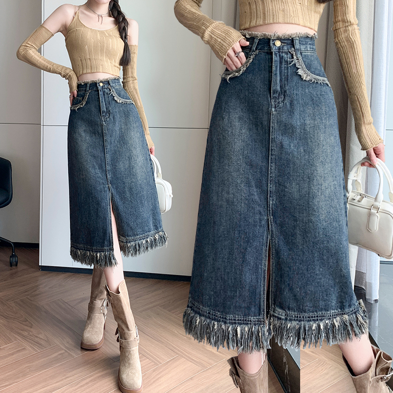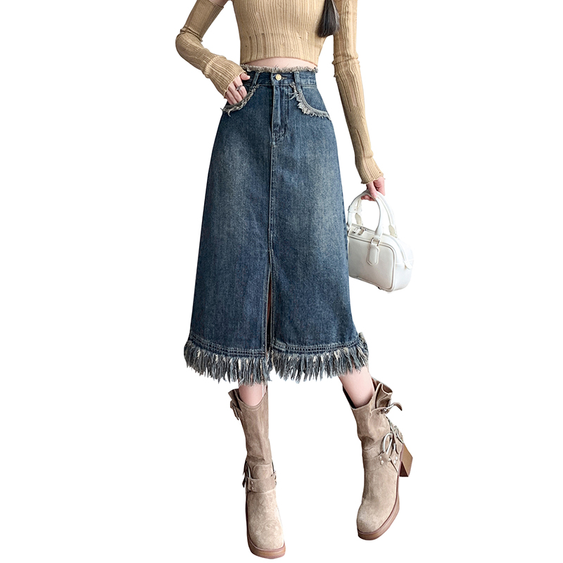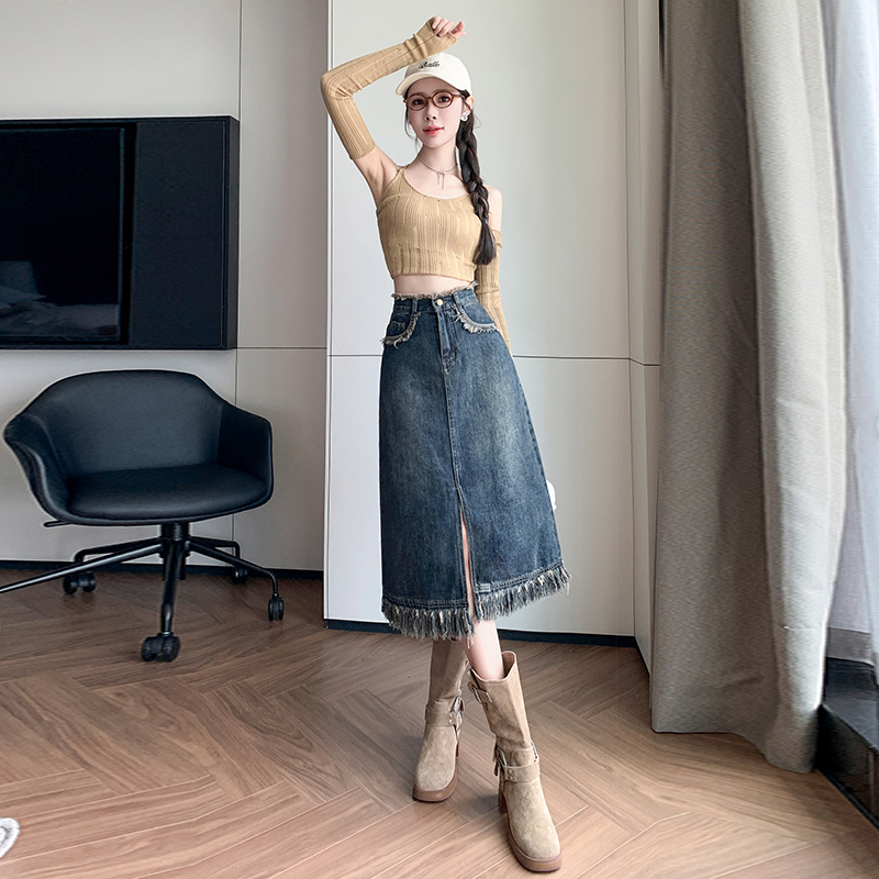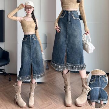 FA43522# 牛仔半身裙女秋季百搭高腰遮胯a字春秋中长款开叉包臀裙 服裝批發女裝批發服飾貨源