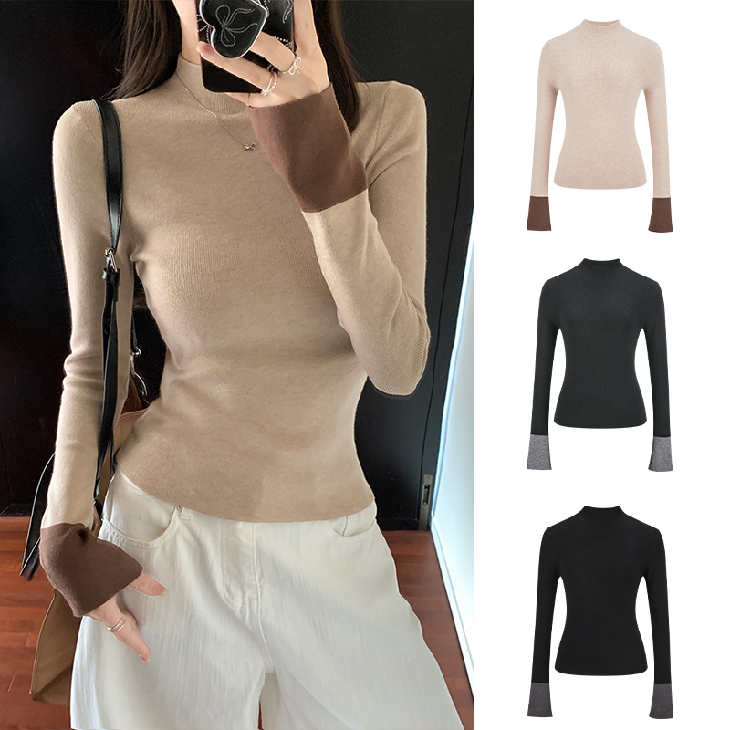FA43944# 撞色半高领针织打底衫女内搭毛衣喇叭长袖上衣 服裝批發女裝批發服飾貨源