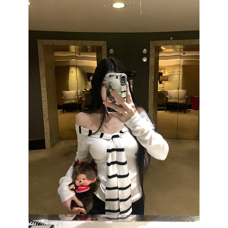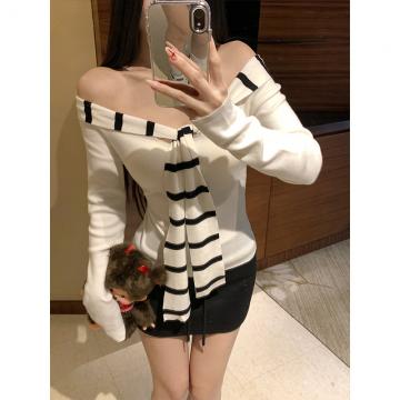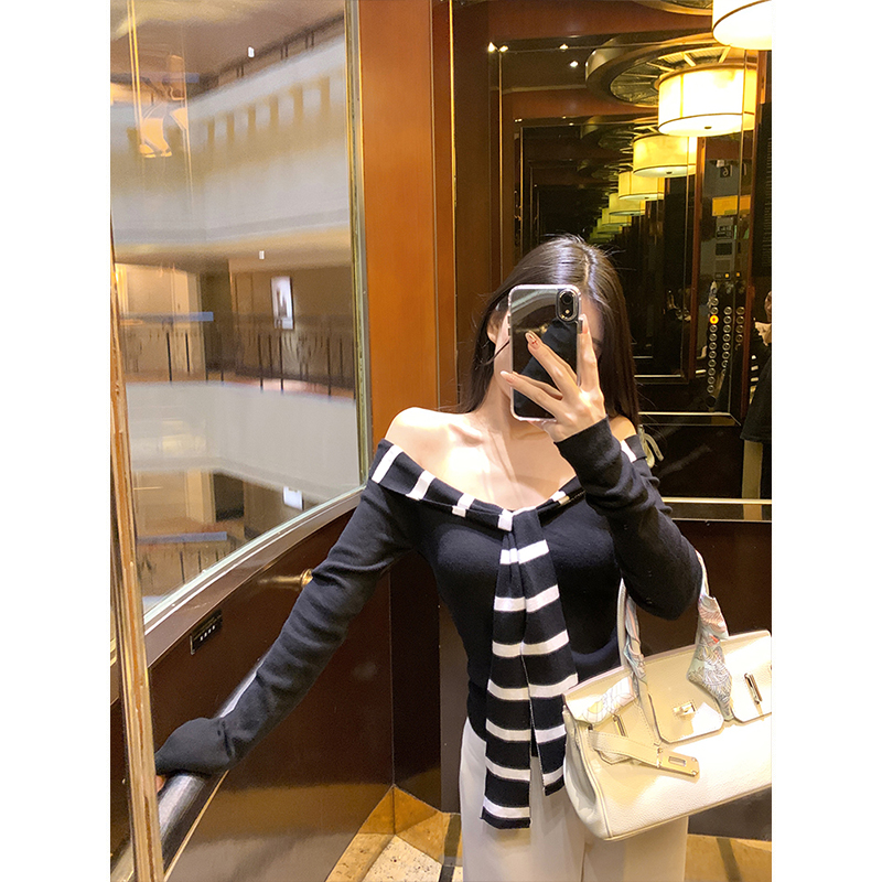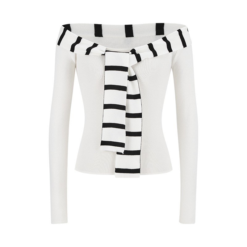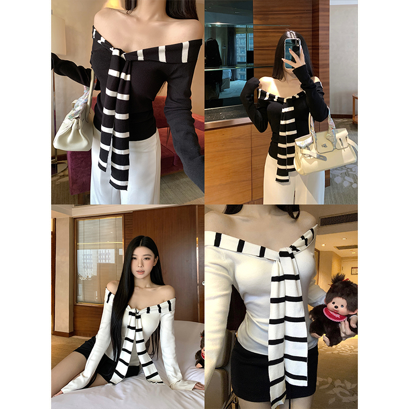 FA43947# 毛针织条纹拼接水手领设计感一字肩修身显瘦长袖打底上衣女 服裝批發女裝批發服飾貨源
