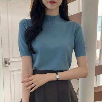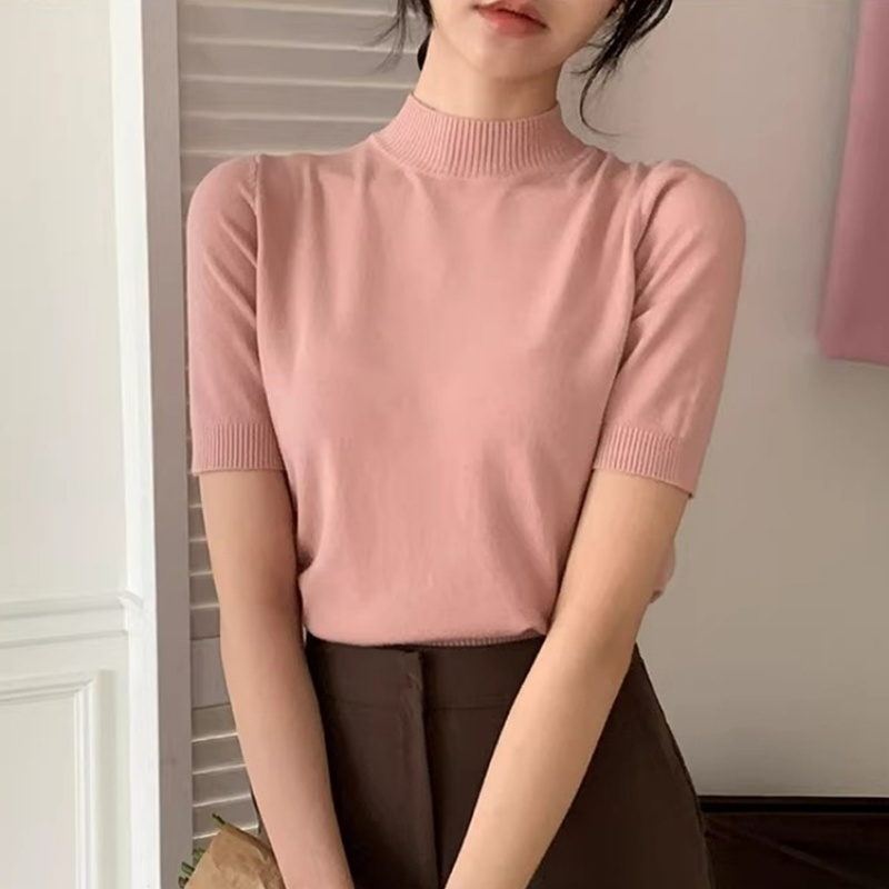 FA43966# 韩国东大门秋装新款气质百搭半高领短袖针织衫女纯色套头显瘦上衣 服裝批發女裝批發服飾貨源