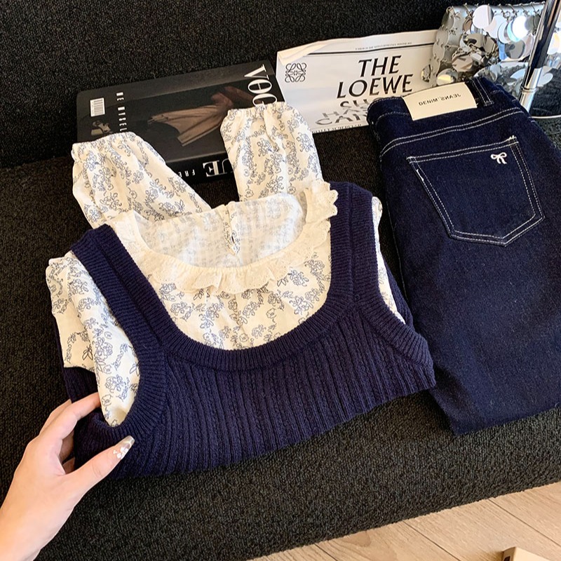 FA44003# 甜美蕾丝花边圆领碎花衬衫外搭针织吊带背心入秋搭配一整套女 服裝批發女裝批發服飾貨源