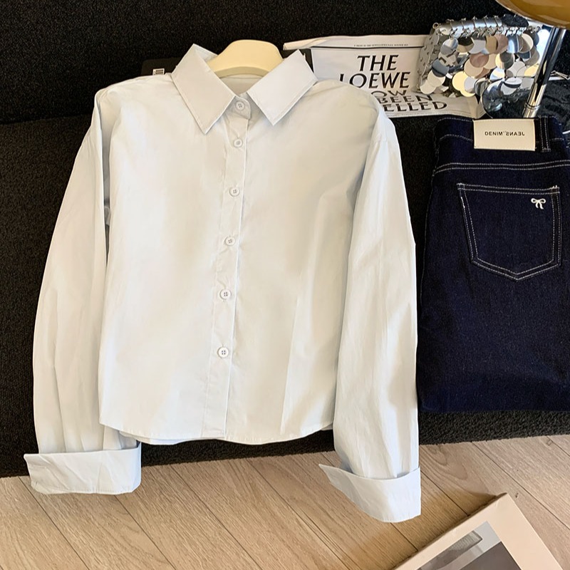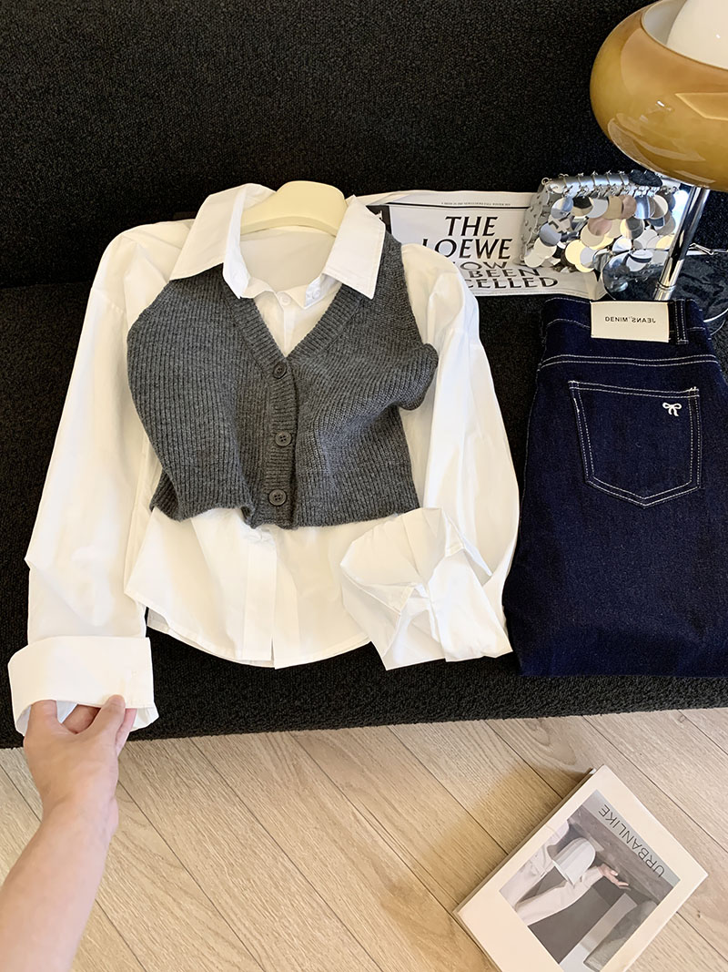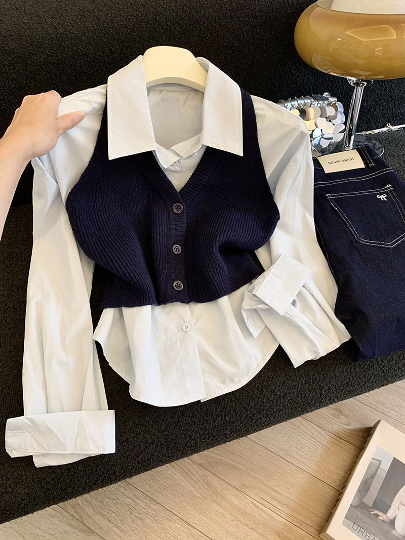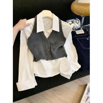 FA44004# 时尚减龄翻领长袖衬衫女秋季外搭短款针织马甲背心两件套 服裝批發女裝批發服飾貨源