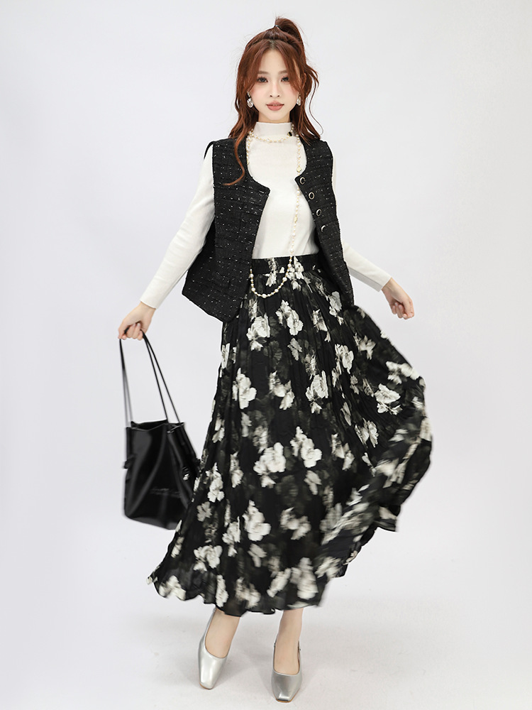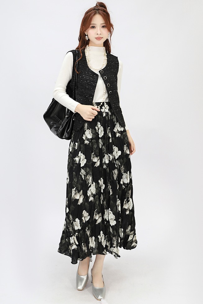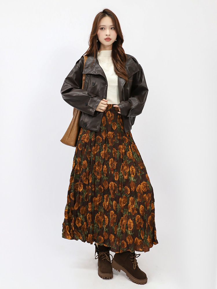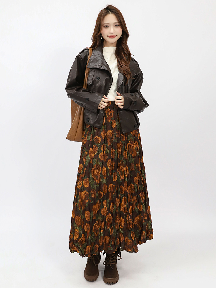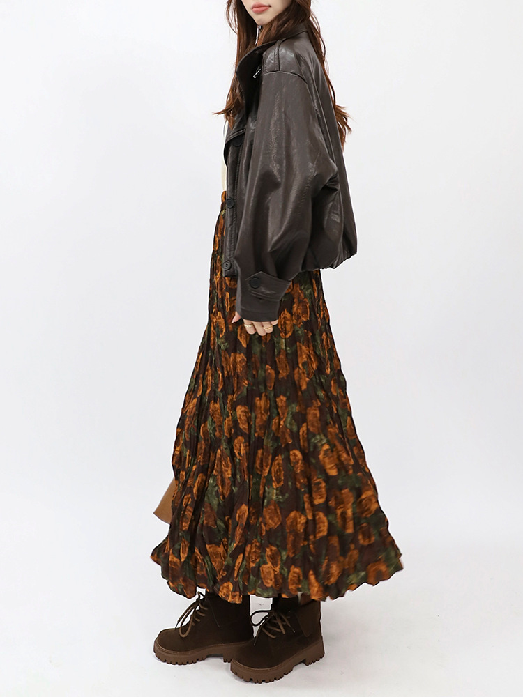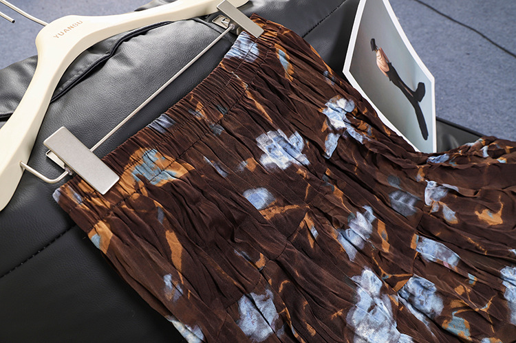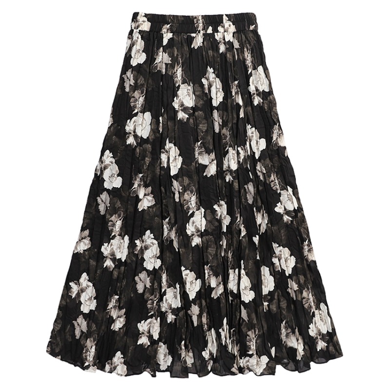 FA44034# 简约复古水墨印花山茶花百褶裙女高腰显瘦大摆印花A字裙 服裝批發女裝批發服飾貨源