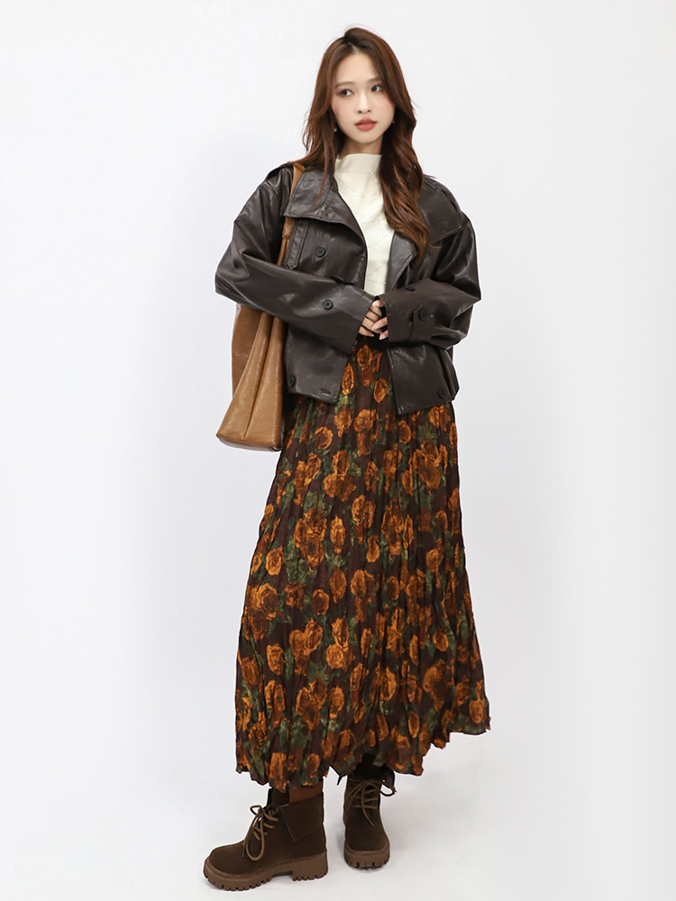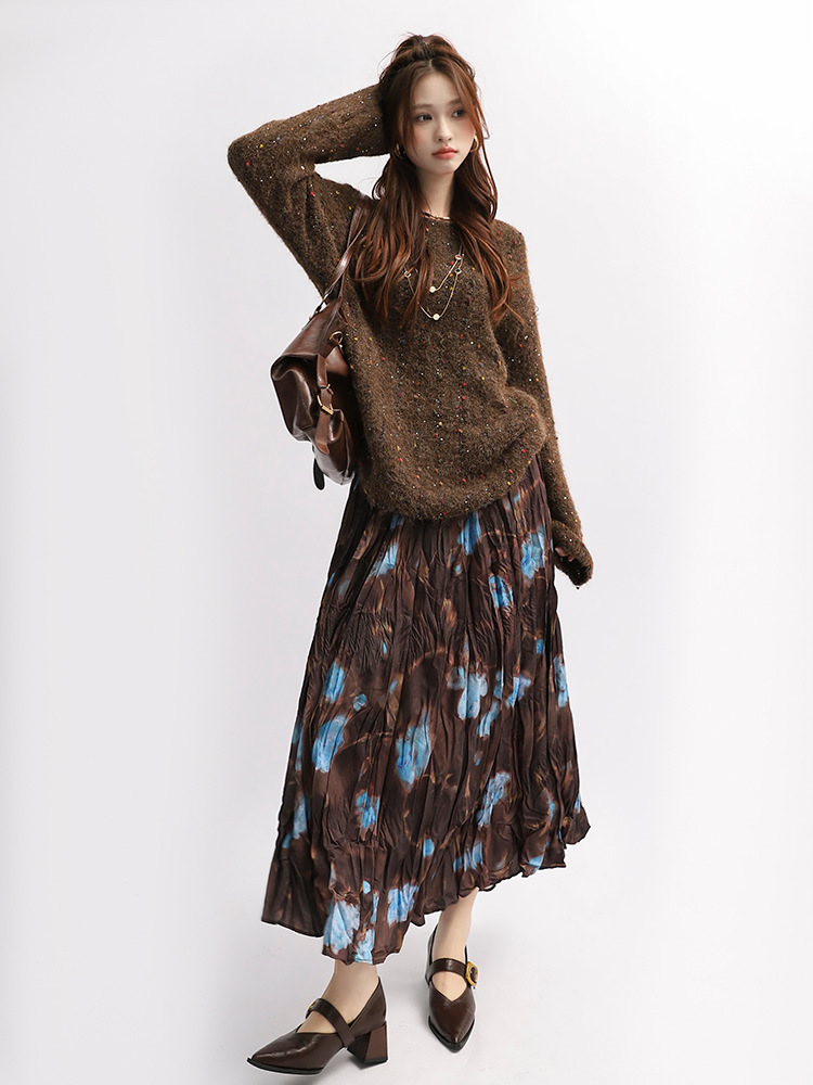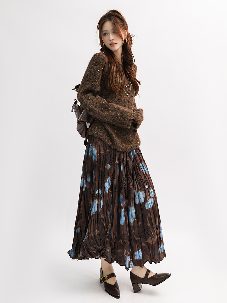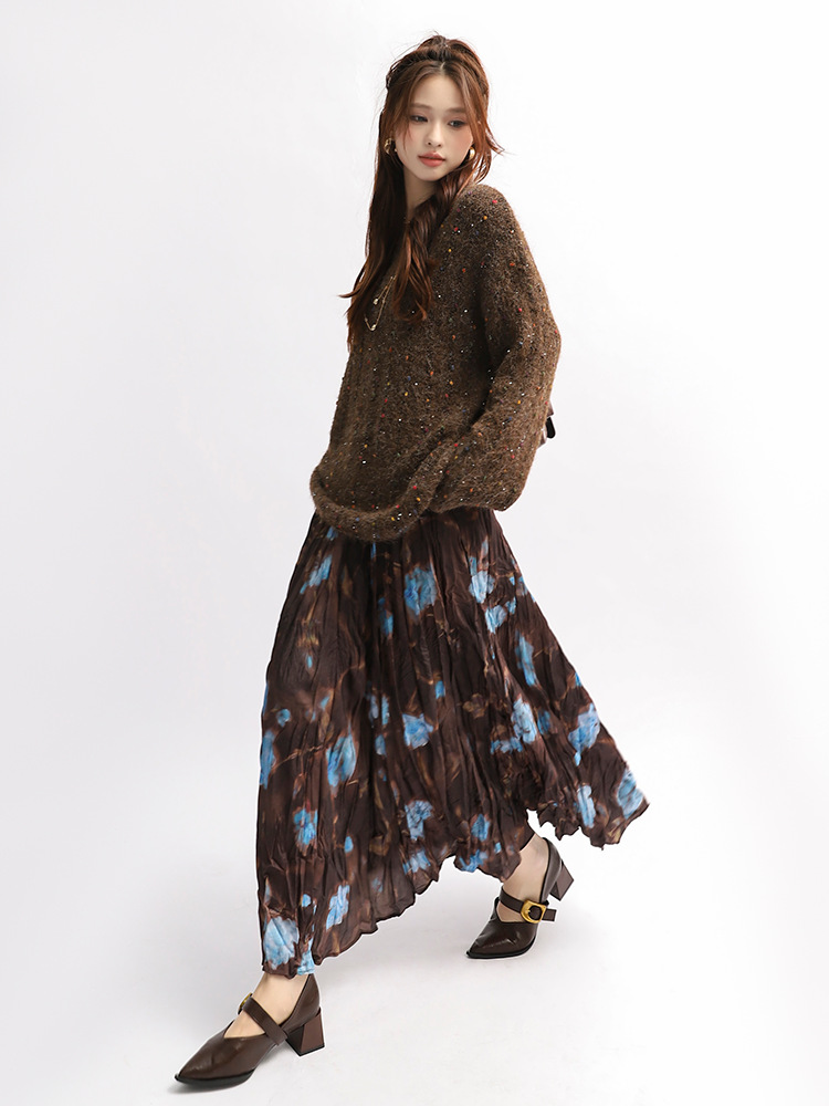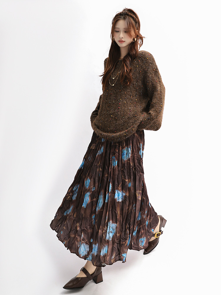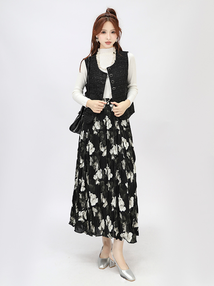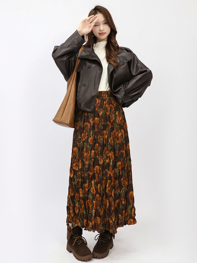 FA44034# 简约复古水墨印花山茶花百褶裙女高腰显瘦大摆印花A字裙 服裝批發女裝批發服飾貨源
