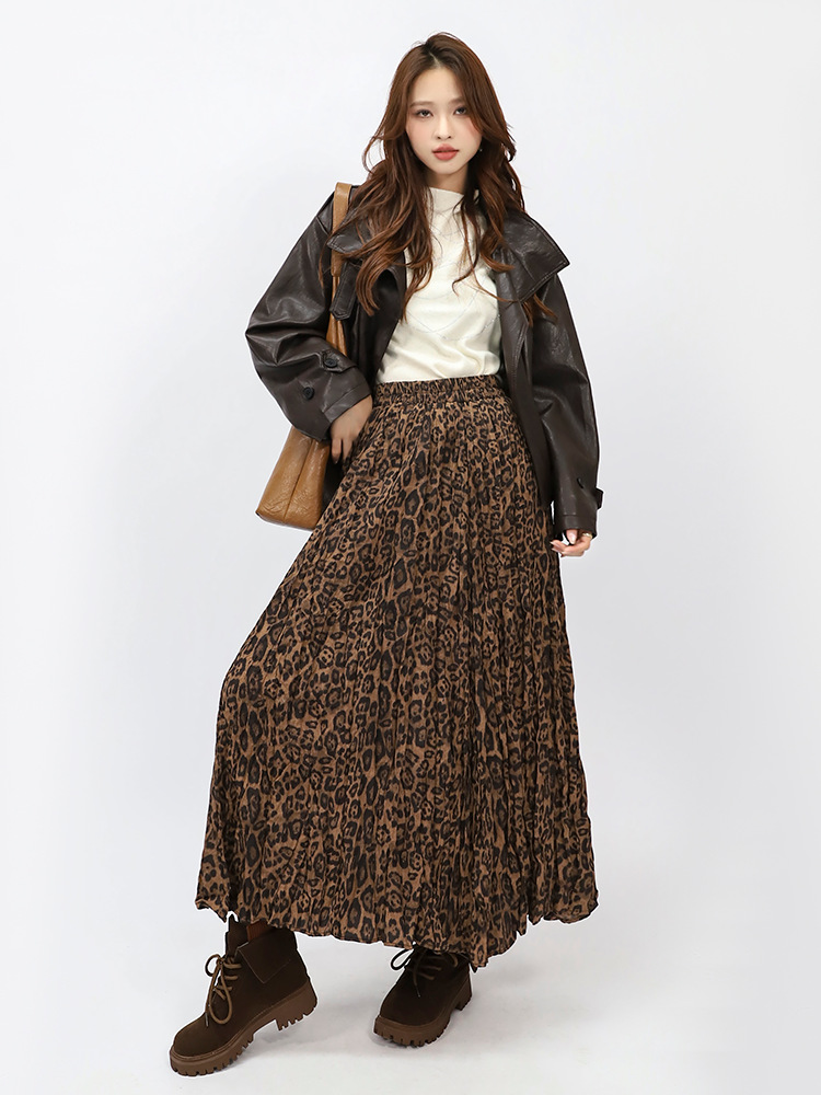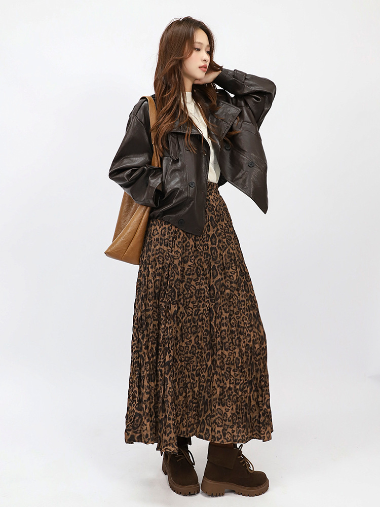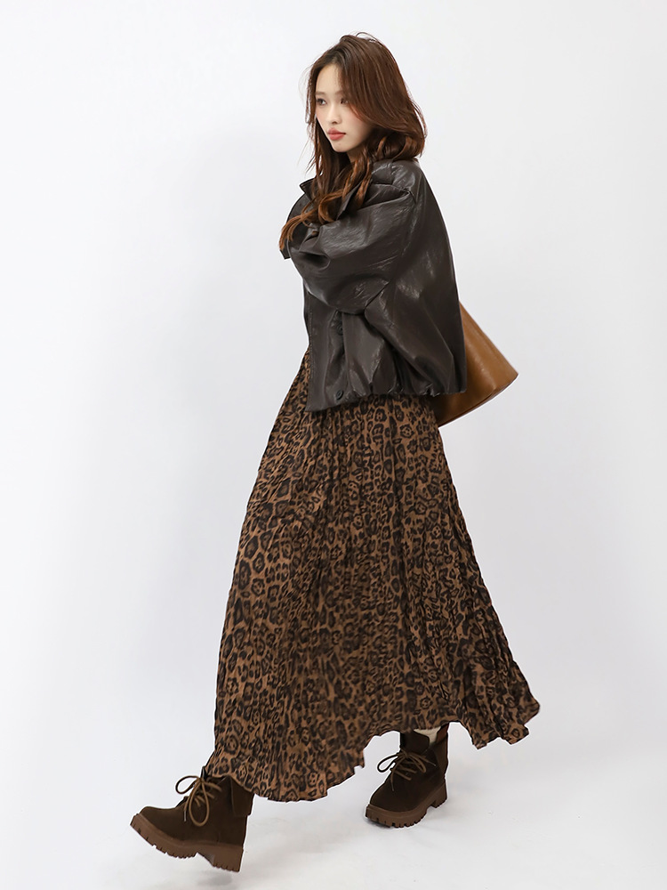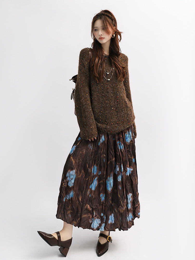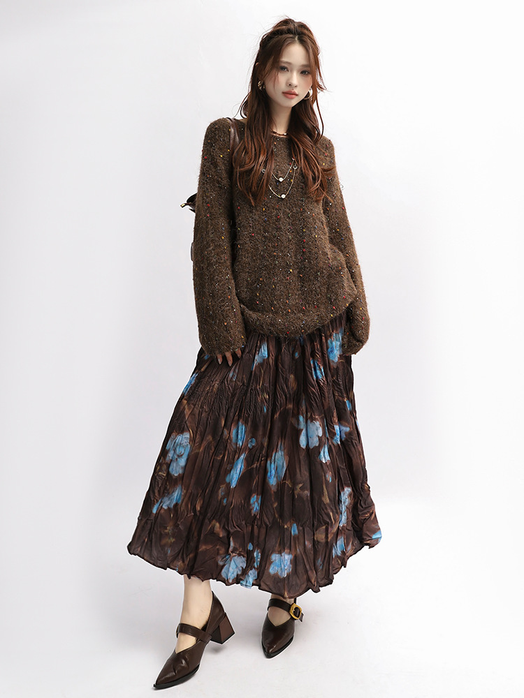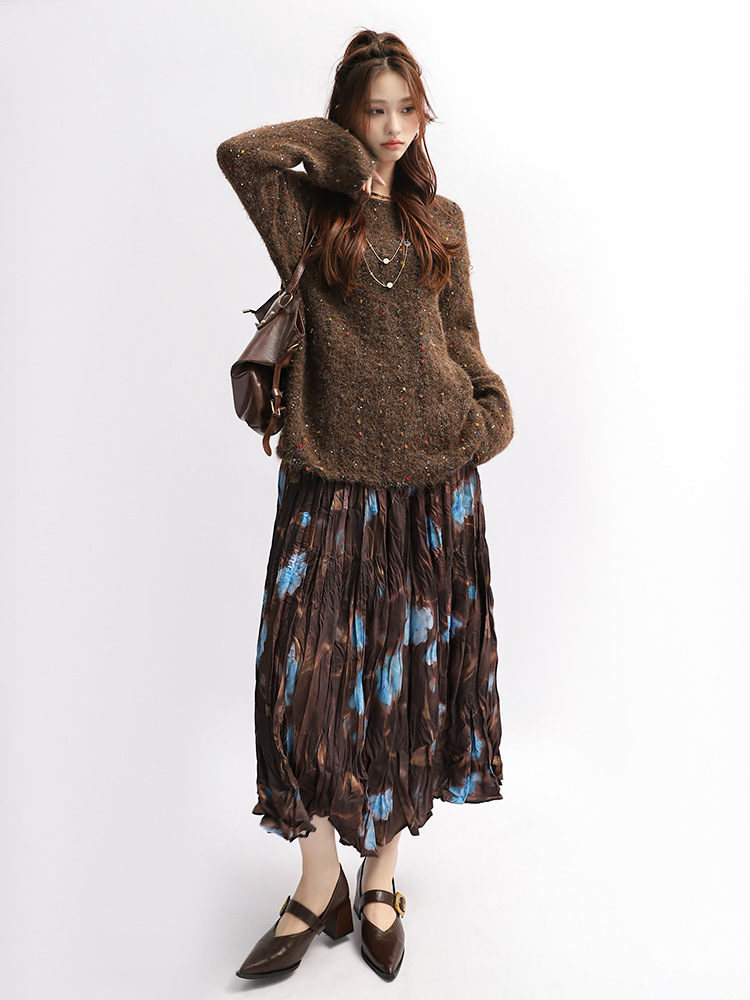 FA44034# 简约复古水墨印花山茶花百褶裙女高腰显瘦大摆印花A字裙 服裝批發女裝批發服飾貨源
