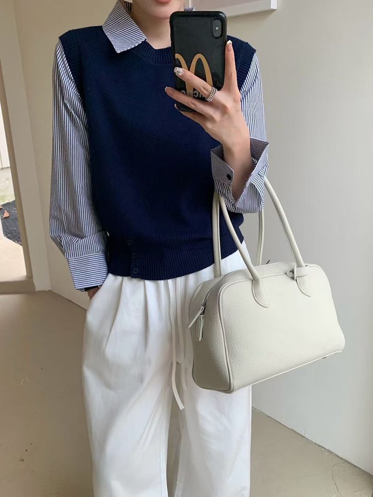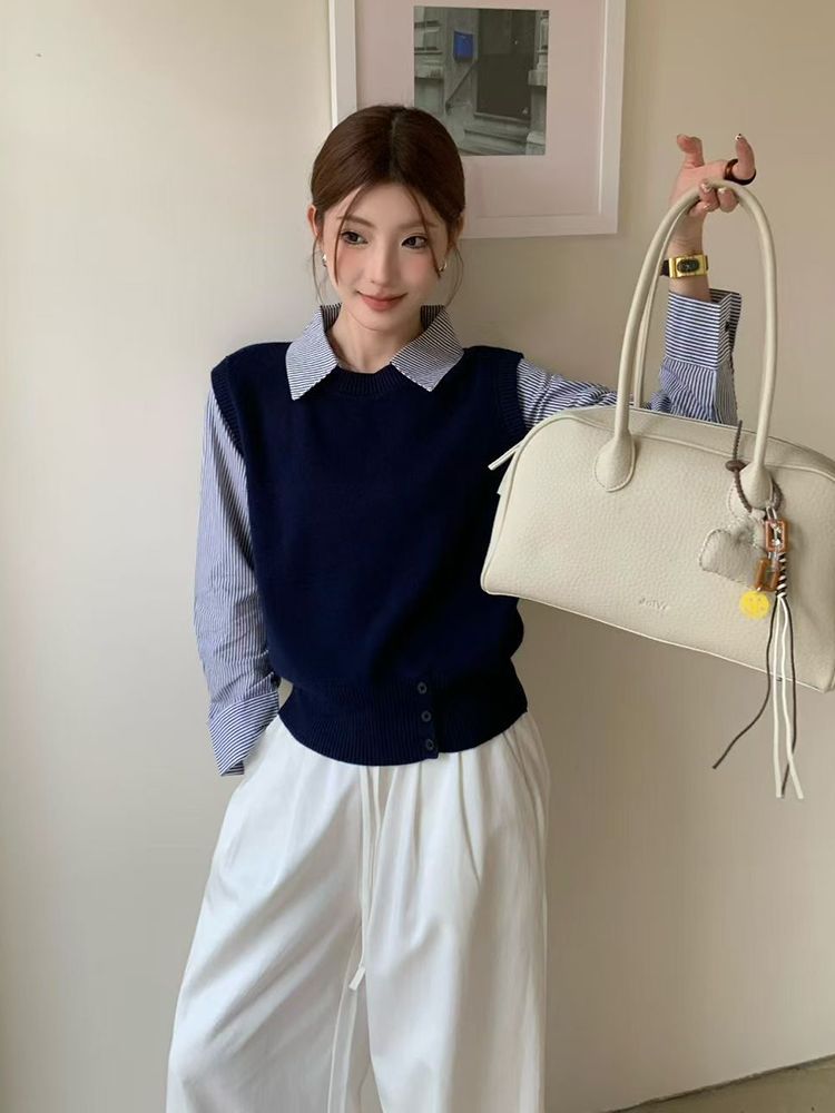 FA44052# 早秋新款韩版设计感条纹衬衫翻领假两件上衣女休闲显瘦针织衫 服裝批發女裝批發服飾貨源