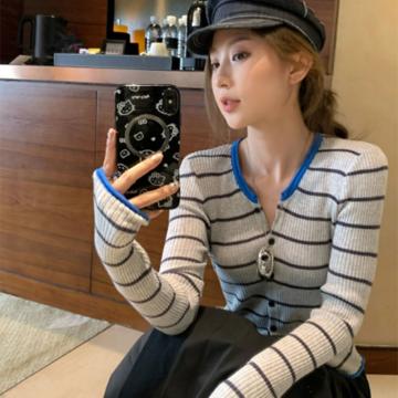 FA44419# 小香风撞色条纹针织开衫女早秋新款韩系穿搭修身短款毛衣上衣 服裝批發女裝批發服飾貨源