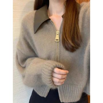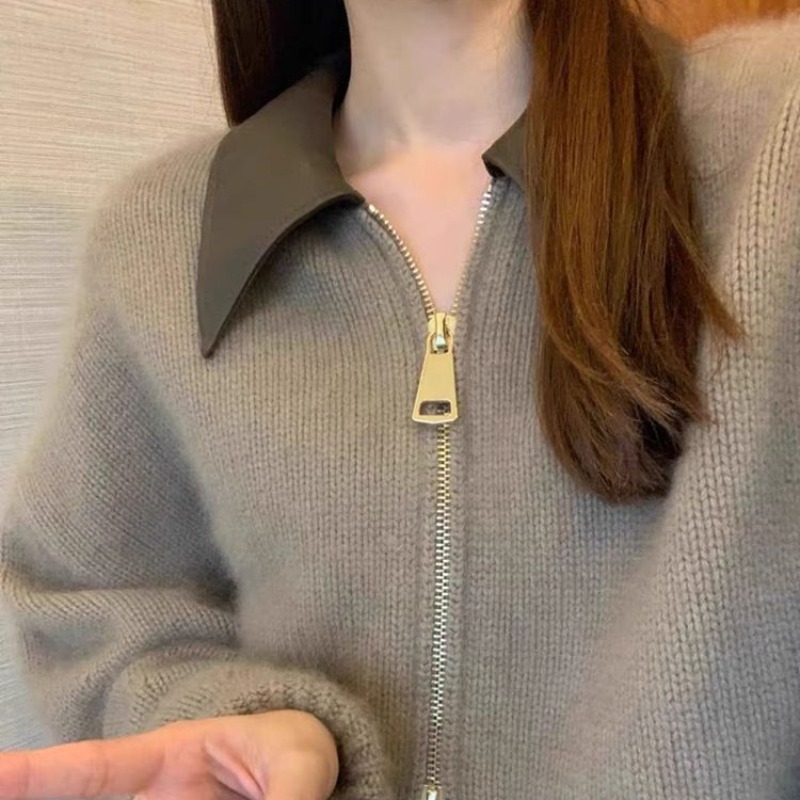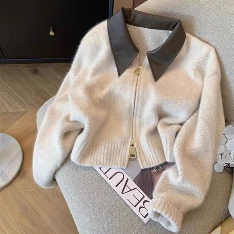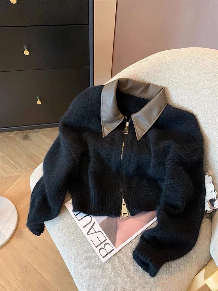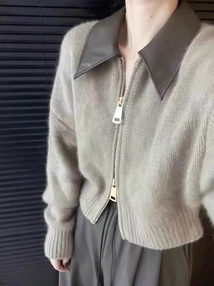 FA44428# 欧货高级感皮POLO领拼接针织开衫女双拉链慵懒风毛衣外套 服裝批發女裝批發服飾貨源