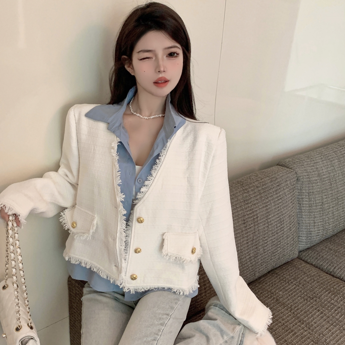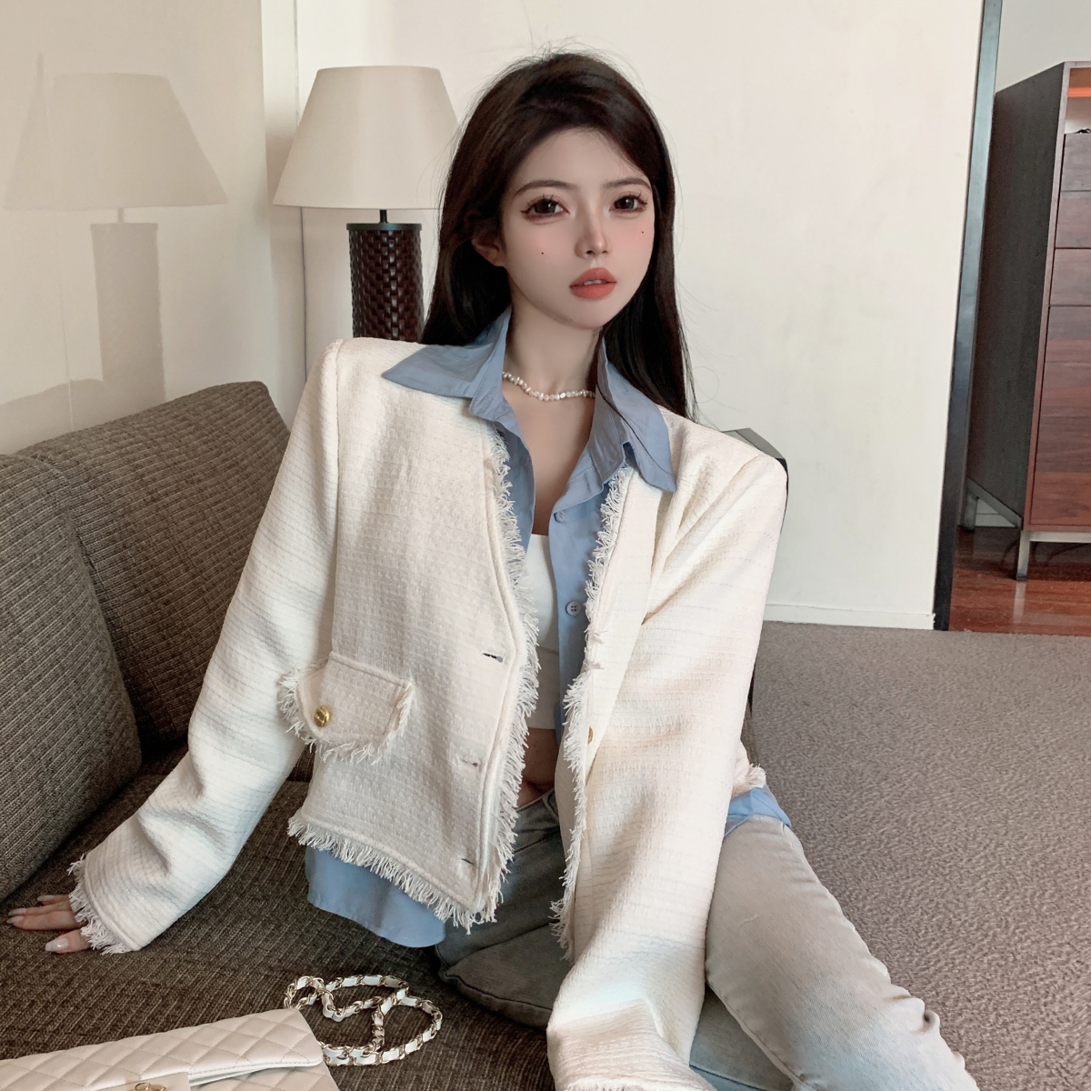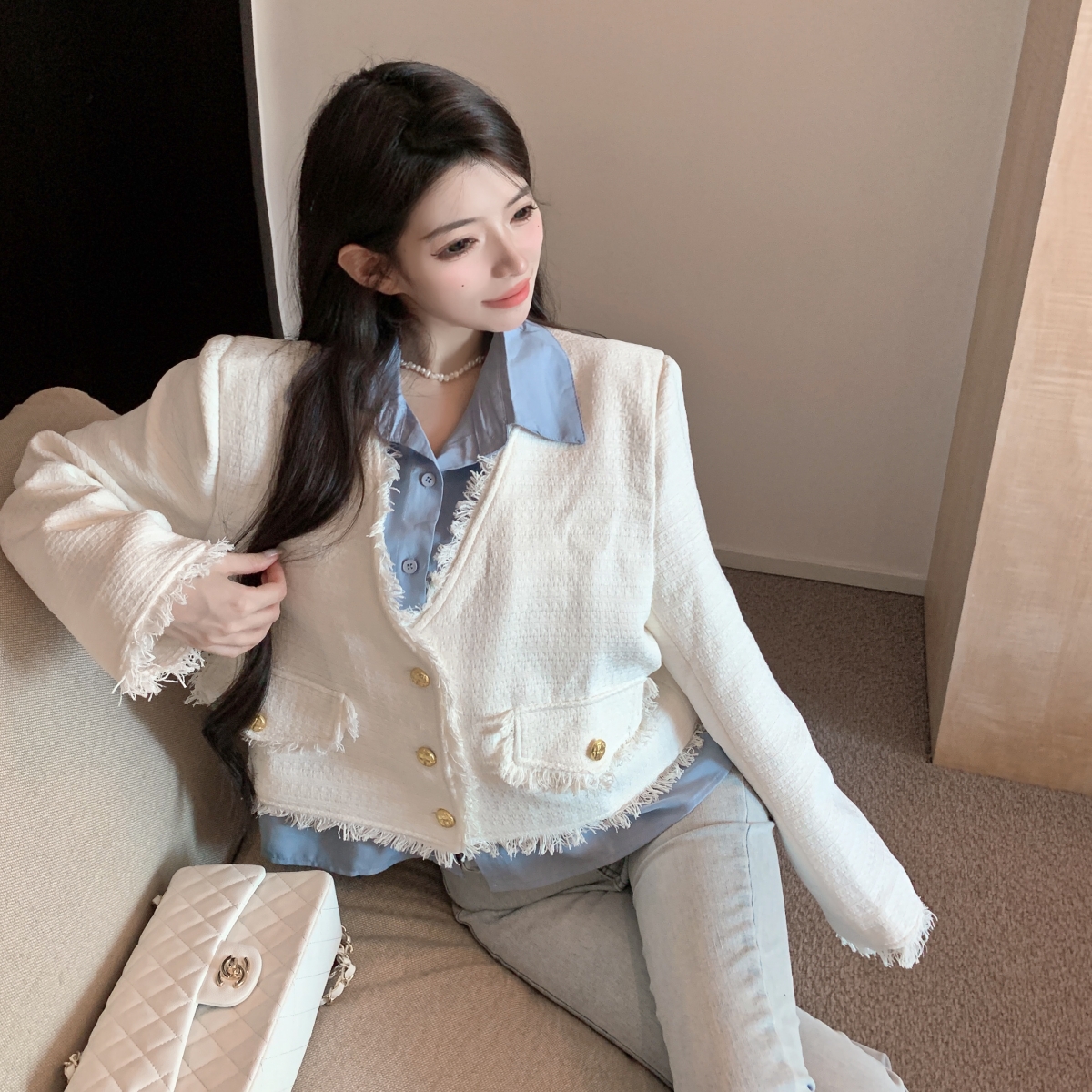 FA44468# 韩版设计感学院风POLO领假两件拼接小香风流苏短外套 服裝批發女裝批發服飾貨源